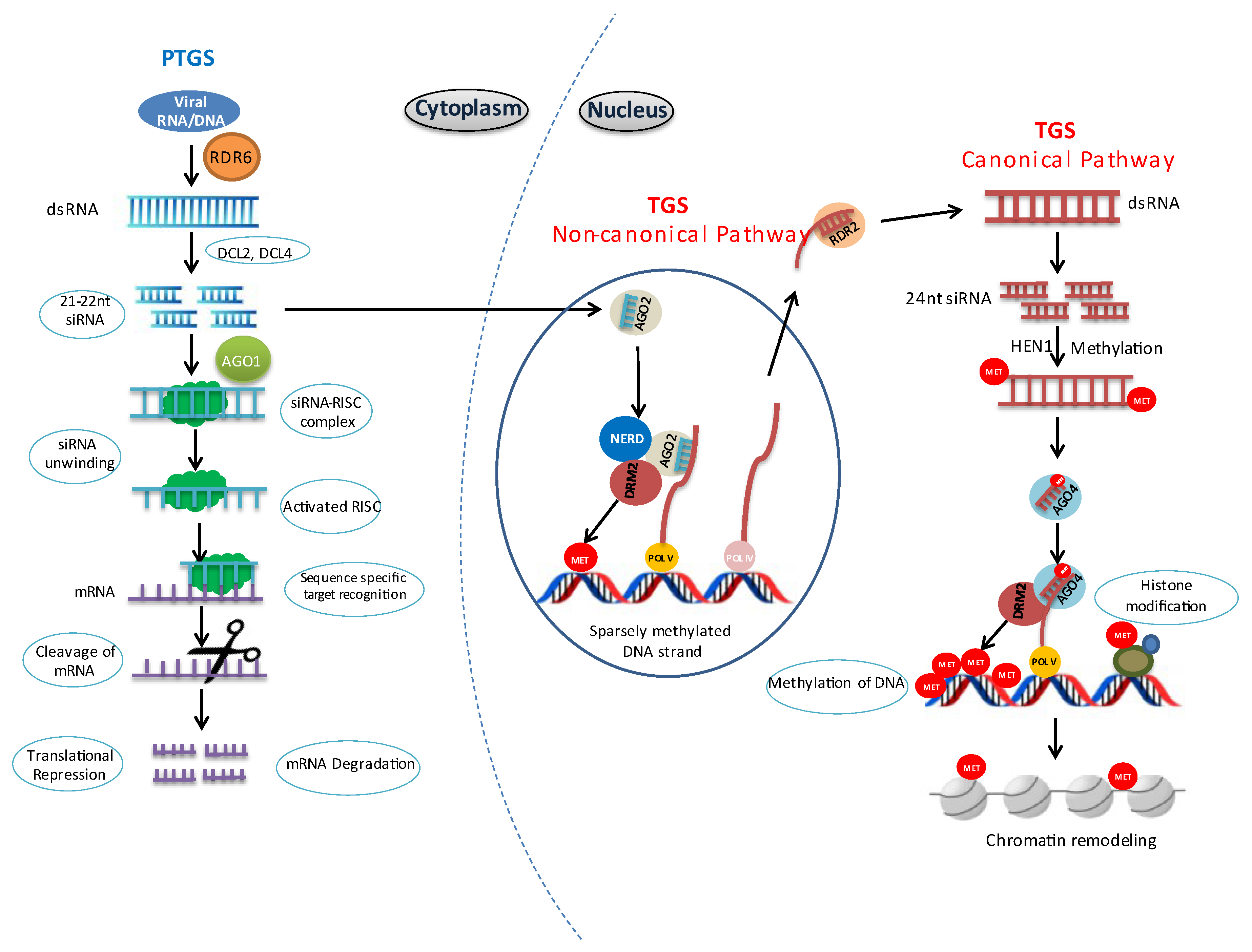 | Host factors involved | Pol IV/V, histone methyltransferases (KYP/SUVH), DOMAINS REARRANGED METHYLTRANSFERASES (DRM), RDRs, DCLs producing 24-nt siRNAs, MET1 | DCL2/4, RDR6, ARGONAUTE proteins (AGO1/AGO2), RISC complexes, ALKBH9B (RNA demethylase) | [51,116,117,118] |
