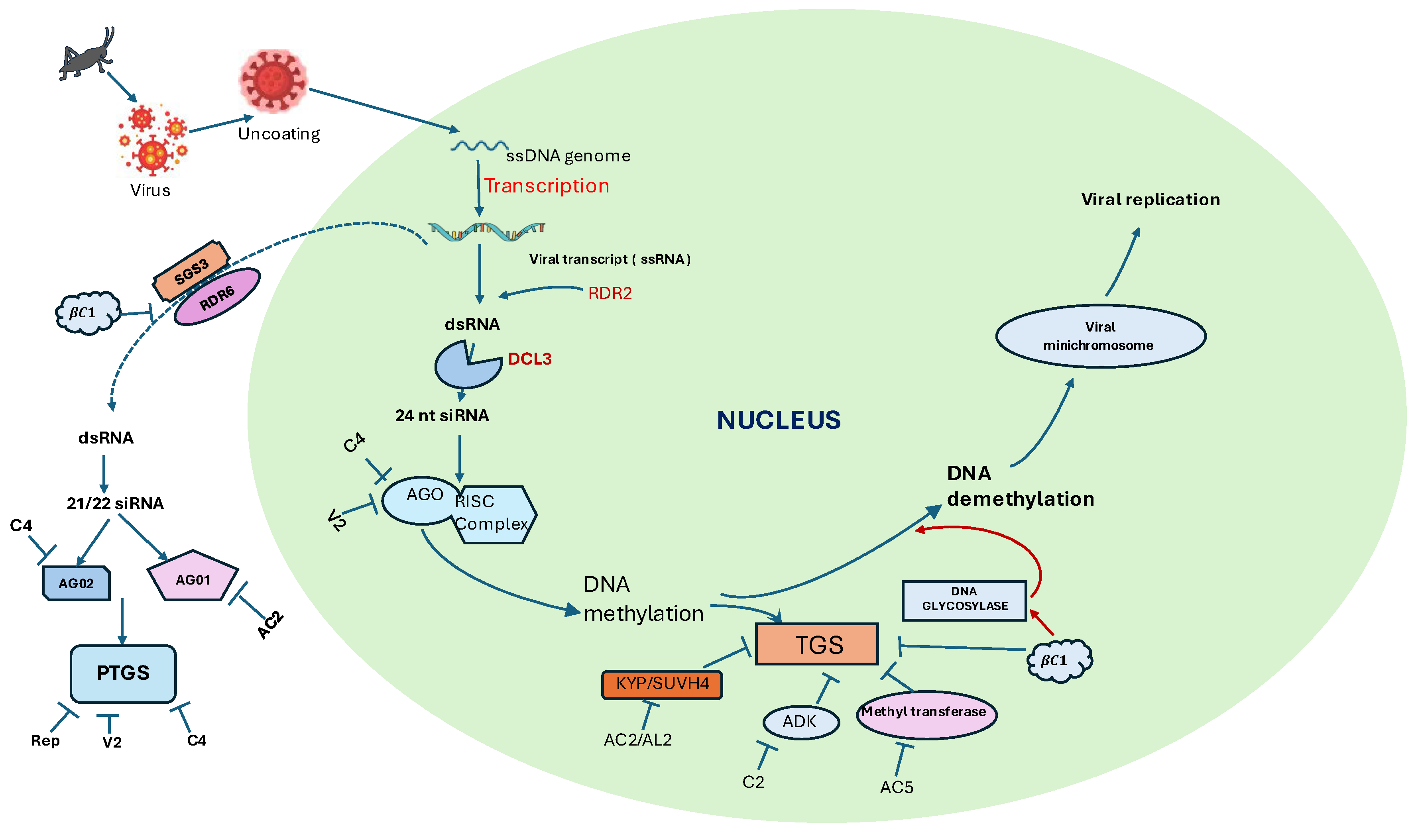 | Pre-coat Protein | TYLCV, ToLCNDV | MET1, RDR1, HDA6 | Suppresses maintenance methylation and chromatin silencing, compromising TGS | [55,56] |