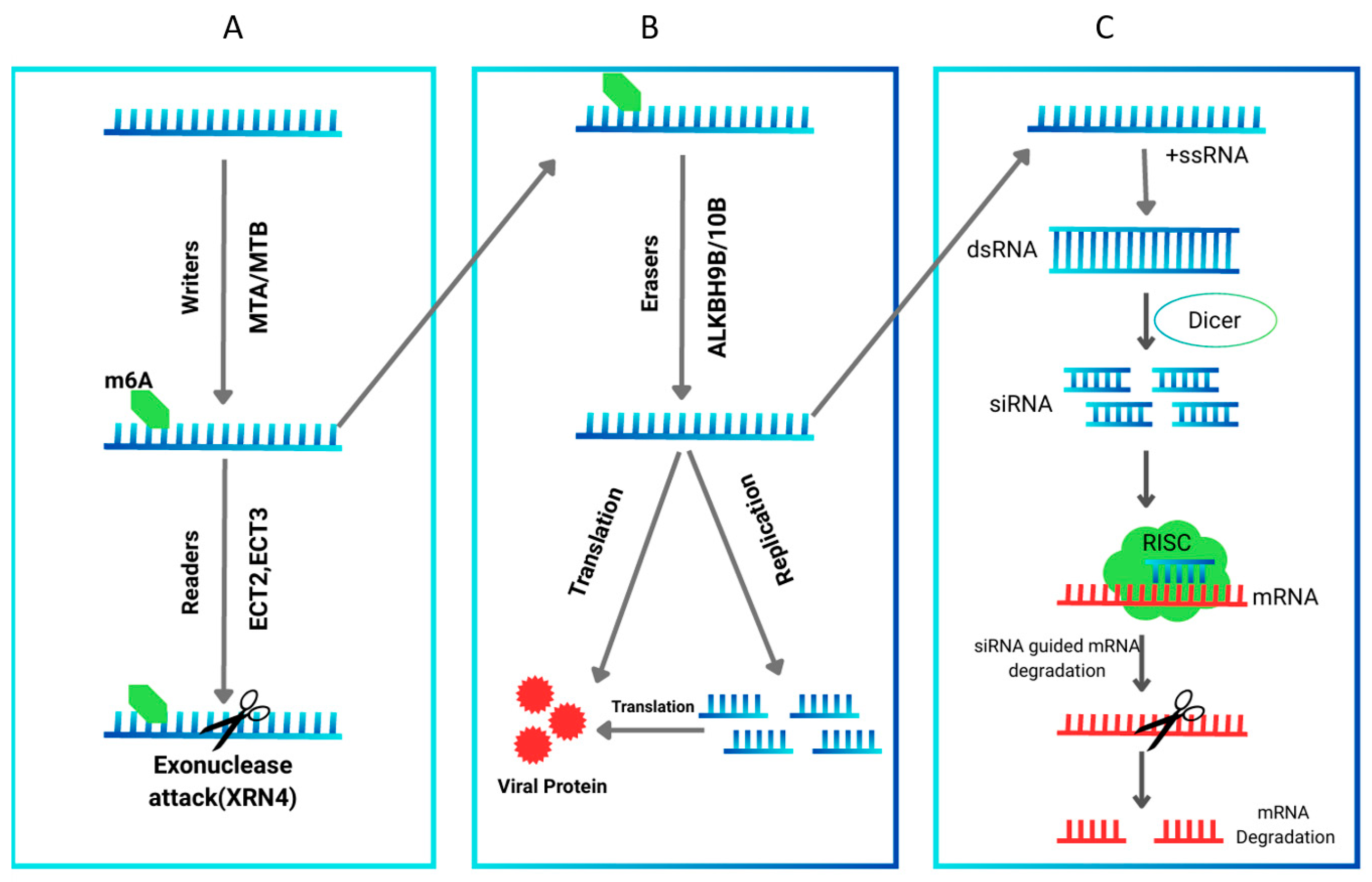 - Yue, J.; Wei, Y.; Zhao, M. The Reversible Methylation of m6A Is Involved in Plant Virus Infection. Biology 2022, 11, 271. [Google Scholar] [CrossRef]