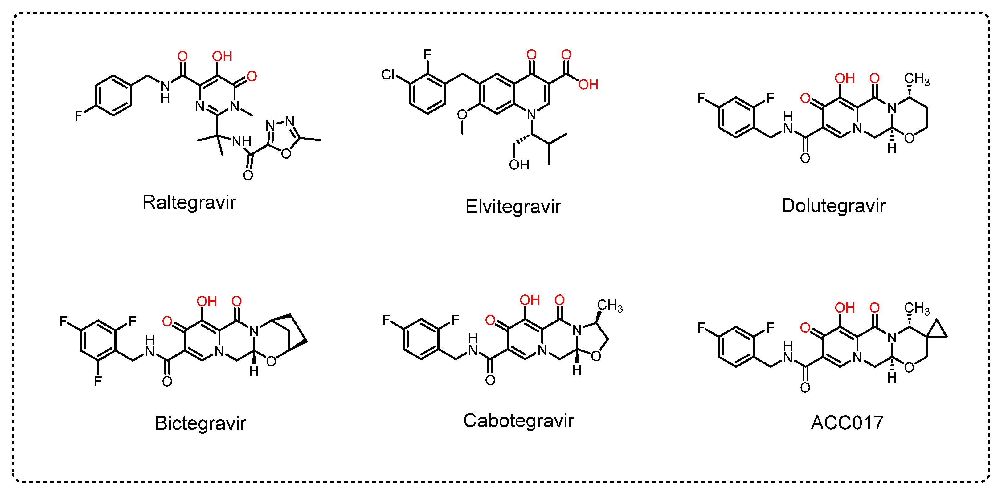 - Shalbi, F.; Ali, A.R. A mini-review on integrase inhibitors: The cornerstone of next-generation HIV treatment. Eur. J. Med. Chem. 2024, 279, 116900. [Google Scholar] [CrossRef]