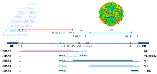 The genome is a linear single-stranded DNA molecule, 5596 nt long, organized in a unique internal region, containing all the open reading frames (ORFs), and flanked by inverted terminal regions that serve as origins of replication. In its internal region, the genome presents two major ORFs, on the left side coding for the non-structural protein NS1 and on the right side coding for the two colinear capsid proteins, VP1 and VP2. Minor ORFs can encode other non-structural proteins, namely the 11 kDa, 9.0, and 7.5 kDa proteins. The genome is encapsidated in an icosahedral shell composed of 60 protein subunits in a T = 1 arrangement, about 25 nm in diameter, composed of 5–10% VP1 and 90–95% VP2 proteins [3]. (Figure 1).