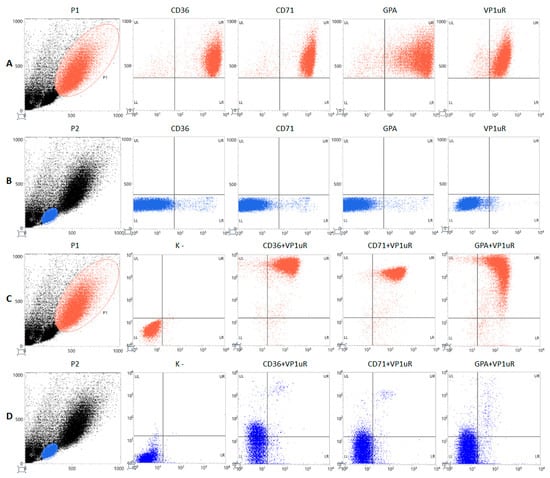 Morphological and phenotypical characterization of EPCs on day 8 of in vitro differentiation. Gating of subpopulations P1 (red dots) (A,C) and P2 (blue dots) (B,D); FSC, X-Axis; SSC, Y-Axis. (A,B): staining for erythroid differentiation markers (CD36, CD71, and GPA) (PE label, X-Axis; FSC, Y-Axis); staining for VP1uR via binding of VP1u (AF488 Label, X-Axis; FSC, Y-Axis). (C,D): negative control and double staining for VP1uR (AF488 Label, X Axis) and erythroid differentiation markers (CD36, CD71, GPA) (PE label, Y-axis).