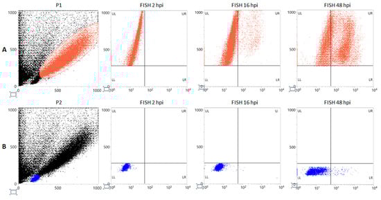 Flow-FISH for viral nucleic acids in infected EPCs. Morphological characterization of EPCs at day 8 of in vitro differentiation and gating of subpopulations P1 (red dots) (A) and P2 (blue dots); (B) at 2 hpi 16 hpi, 48 hpi; FITC labeling, X-Axis. FSC, Y-Axis.