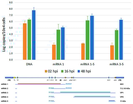 Total nucleic acids were then investigated by qPCR analysis, to quantitate the variation in the amount of viral DNA, and qRT-PCR, to quantitate the variation in the amount of total mRNA via the central exon (mRNA 1–5) and of specific subsets of viral mRNAs, particularly the unspliced mRNAs (mRNA 1) or the distally cleaved mRNAs (mRNA 3–5) (Figure 4). Viral DNA, starting from a 5.73 Log B19V genome copy at 2 hpi (per 104 cells, ~7% of viral input), showed a +0.59 Log variation from 2 to 16 hpi, reaching +2.04 Log at 48 hpi, confirming a productive infection pattern. Total viral mRNA, already detectable at 2 hpi (2.56 Log), showed a +3.62 Log variation at 16 hpi and a +4.36 Log variation at 48 hpi, also confirming the productive pattern of infection. The majority of mRNAs were constituted by the spliced, proximally cleaved mRNAs (mRNA 2); unspliced, proximally cleaved mRNAs (mRNA1) coding for the NS1 protein were present at 5.5% and 1.4% abundance at 16 hpi and 48 hpi, respectively; and the distally cleaved mRNAs (mRNA 3–5), coding for the VP1, VP2 and 11 kDa proteins, were present at 1.5% and 22.7% abundance at 16 hpi and 48 hpi, respectively. This pattern is in accordance with the known expression profile of B19V, at early and late times of infection, and in relation to the replication of the viral genome.