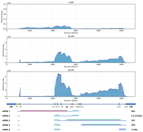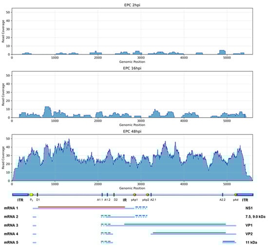 To identify B19V mRNAs within total transcriptomic HTS data, processed reads were selected and aligned on the reference EC B19V genome (Figure 6). Reads mapping on the viral genome constituted a barely detectable 0.001% at 2 hpi, increasing to 1.8% at 16 hpi and reaching 24% at 48 hpi. The identification of viral reads and their alignment on the B19V genome, significative at 16 hpi and especially at 48 hpi, allowed for tentative reconstruction of the viral transcriptome. The different regions of the viral genome were differentially represented in relation to the pre-mRNA processing events and generation of mature mRNAs, showing good correspondence to the known transcription map of B19V; the few reads identified at 2 hpi mapped on the left side of the genome, in correspondence with the NS1 coding region, while the reads mapped at 16 and 48 hpi were mostly in the central exon region and on the right side of the genome, in correspondence with VP1/2 and 11 kDa coding regions. However, a systematic bias was observed in the coverage, resulting in abundance gradients from the center to the extremities of represented exons. Thus, by normalizing the number of reads mapped to the different genomic regions to the respective length in bases, a fractional distribution was obtained confirming a higher relative representation of the leader and central exons, compared to the regions coding for NS and VP proteins and to the terminal exon (Table 3).