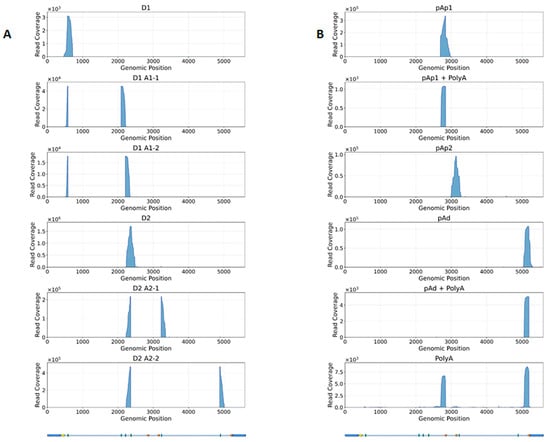 To obtain a more accurate evaluation of the relative abundance of the different viral mRNAs, a complementary strategy was followed, aimed at determining the frequency of alternative splicing and cleavage-polyadenylation processing patterns. For this purpose, all reads mapping to the B19V genome and spanning the reported splice junctions and cleavage-polyadenylation sites (Appendix A, Table A2) were specifically selected, mapped, and quantitated (Figure 7). This closer inspection of mapping involved the known mRNA processing sites: (1) start of transcription at nt 530; (2) donor/acceptor splice sites at 586/2089–2209 (D1/A1.1–A1.2); donor/acceptor splice sites at 2363/3224–4883 (D2/A2.1–A2.2); the pAp1 cleavage-polyadenylation site at 2842, and the pAp2 site at 3142; and the pAd distal cleavage polyadenylation site at 5189. The frequency of utilization of the different signals was reconstructed by the relative frequency of reads mapped at each selected site (Table 4).