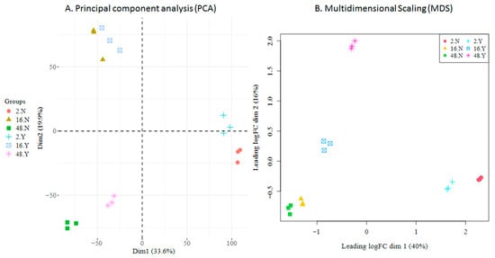 HTS cellular transcriptome; data exploration. (A). Principal Component Analysis (PCA); the two main dimensions account for 53% of total variation. (B). Multidimensional Scaling (MDS); the two main dimensions account for 56% of total variation. Groups are defined as hpi (2, 16, 48), not-infected or infected (N, Y), and replicate (1–3).