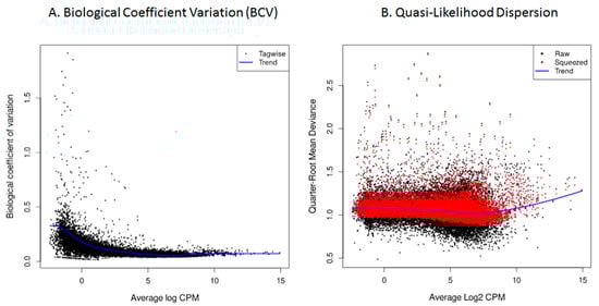 As a quality assessment, gene count dispersion was visualized using a Biological Coefficient Variation (BCV) plot. This coefficient estimates the irreducible variation in true gene abundance between replicates. In the analyzed samples, BCV values were low, allowing for a better distinction of differentially expressed genes (DEGs) with higher reliability (Figure 9A). After fitting the model with the glmQLFit function of edgeR, quasi-likelihood dispersion (Equation (2)) was visualized using plotQLDisp. The tight clustering of the squeezed data points around a relatively stable trend line across expression levels indicates that the quasi-likelihood dispersions was well estimated and that the variance structure was appropriately captured by the model (Figure 9B).