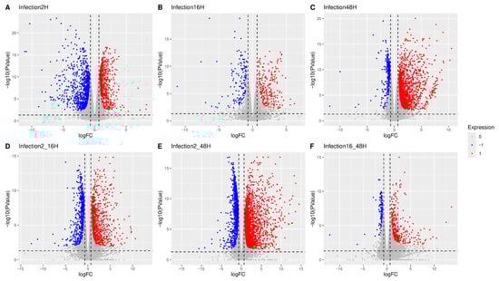 To assess the temporal and infection-related dynamics of gene expression, a multifactorial linear model was employed, incorporating the variables of hours post-infection (hpi) and infection status, along with their interaction terms.