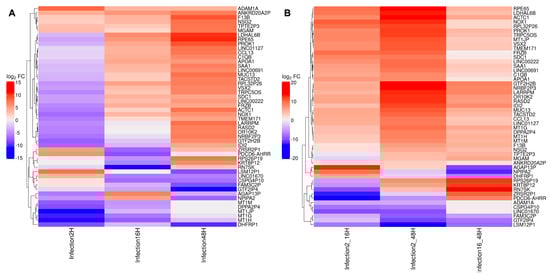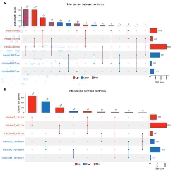 This design enabled the interrogation of both the main effects (infection or time alone) and interaction effects (e.g., impact of infection over time) leading to gene dysregulation. Linear combinations of model coefficients, also referred to as contrasts, defining specific biological comparisons of interest were created using the limma R package (v3.64.1) [28] to analyze the effect of infection at each time point as well as the differential effect of infection across time points.