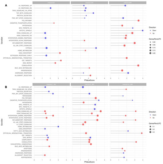 Competitive gene set testing was performed using the Camera [31] method implemented in edgeR, evaluating the enrichment of genes across the MSigDB hallmark collection accounting for inter-gene correlation [32]. This analysis evaluated the enrichment of dysregulated gene sets associated with curated biological pathways and conditions within the experimental data. Lollipop plots visualizing the direction of dysregulated gene sets, as well as the percentage of dysregulated genes in each set, was created using ggplot2.