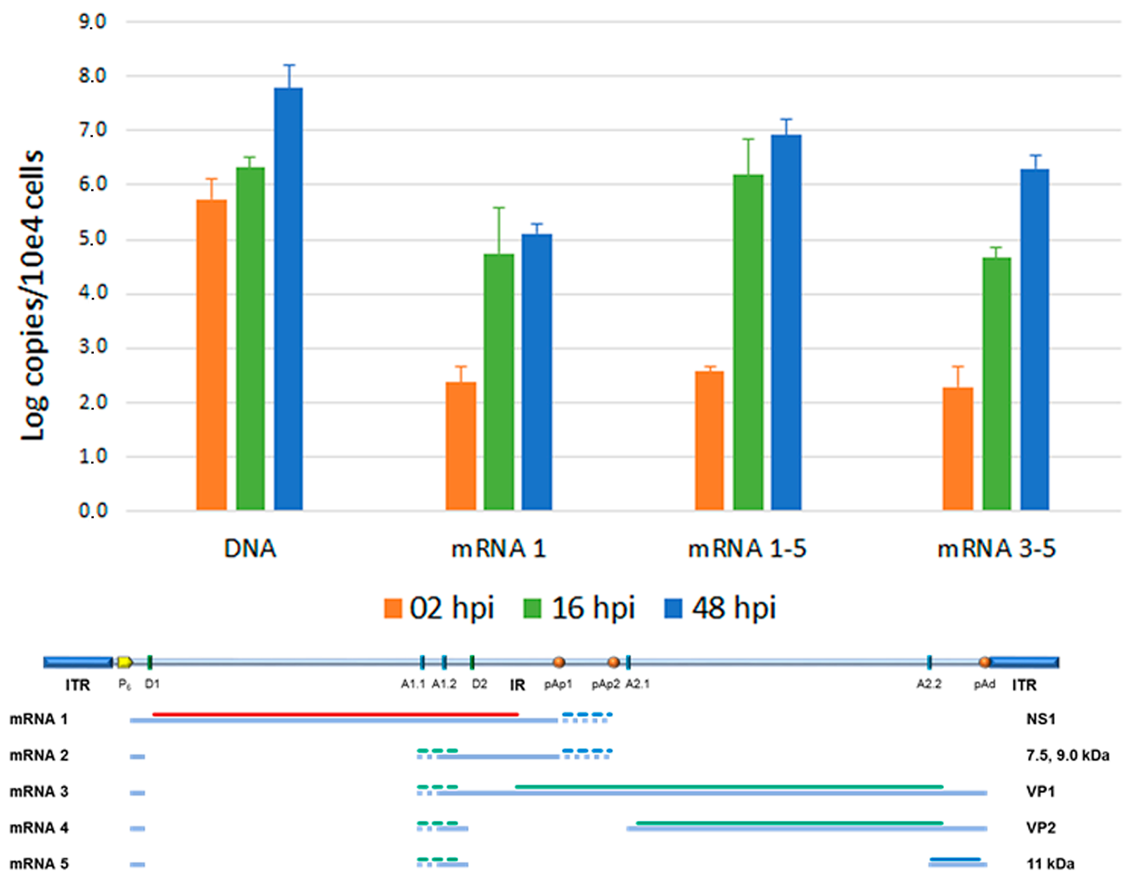 - Guan, W.; Cheng, F.; Yoto, Y.; Kleiboeker, S.; Wong, S.; Zhi, N.; Pintel, D.J.; Qiu, J. Block to the production of full-length B19 virus transcripts by internal polyadenylation is overcome by replication of the viral genome. J. Virol. 2008, 82, 9951–9963. [Google Scholar] [CrossRef]