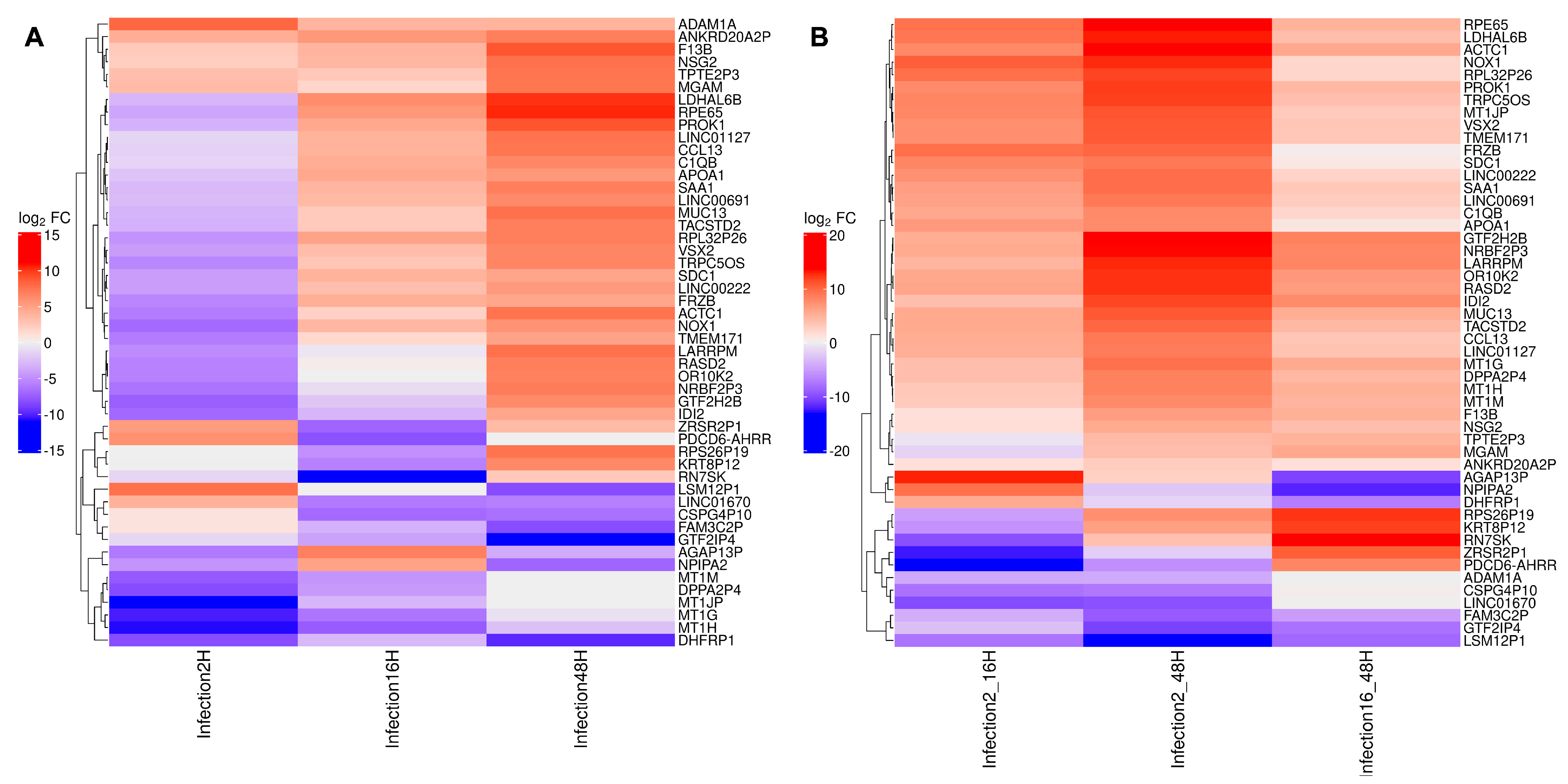 | 16 hpi | 1 | 15 | 0.82 | CCL2, TLR2, CA12, SERPINE1, LOX, TIMP1, MMP9, PF4, TGFBI, ELANE, PLAU, PLAUR, MMP14, FOSL2, SELENBP1 | Extracellular matrix organization Hemostasis | 1.43 |