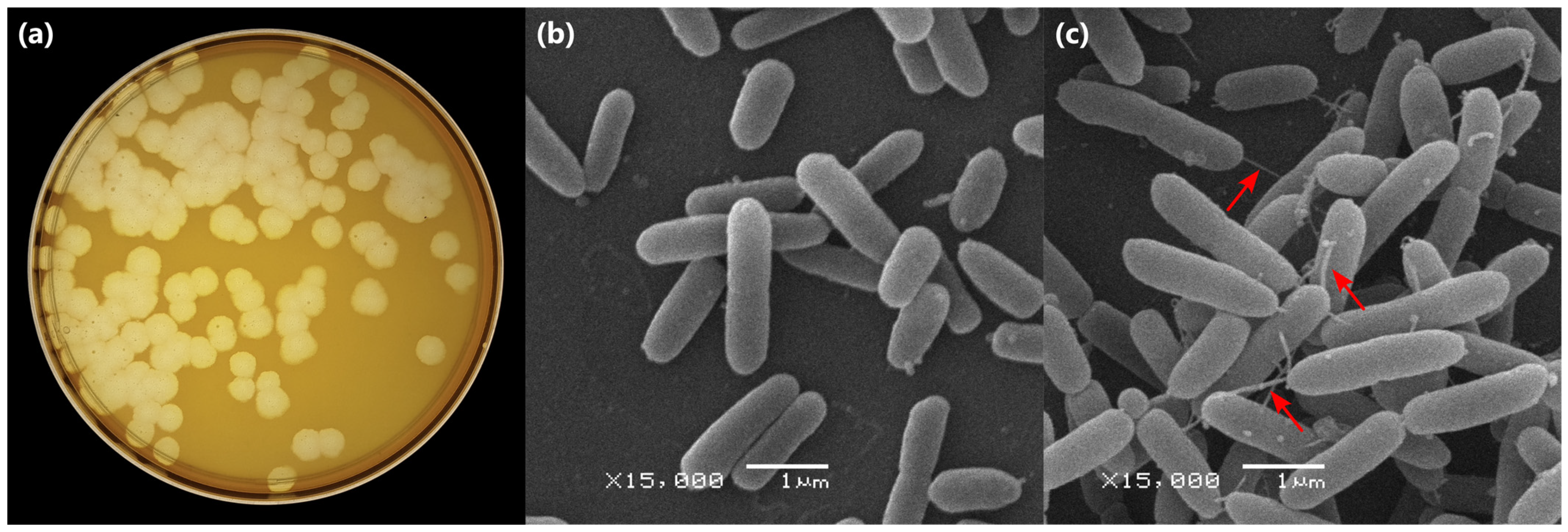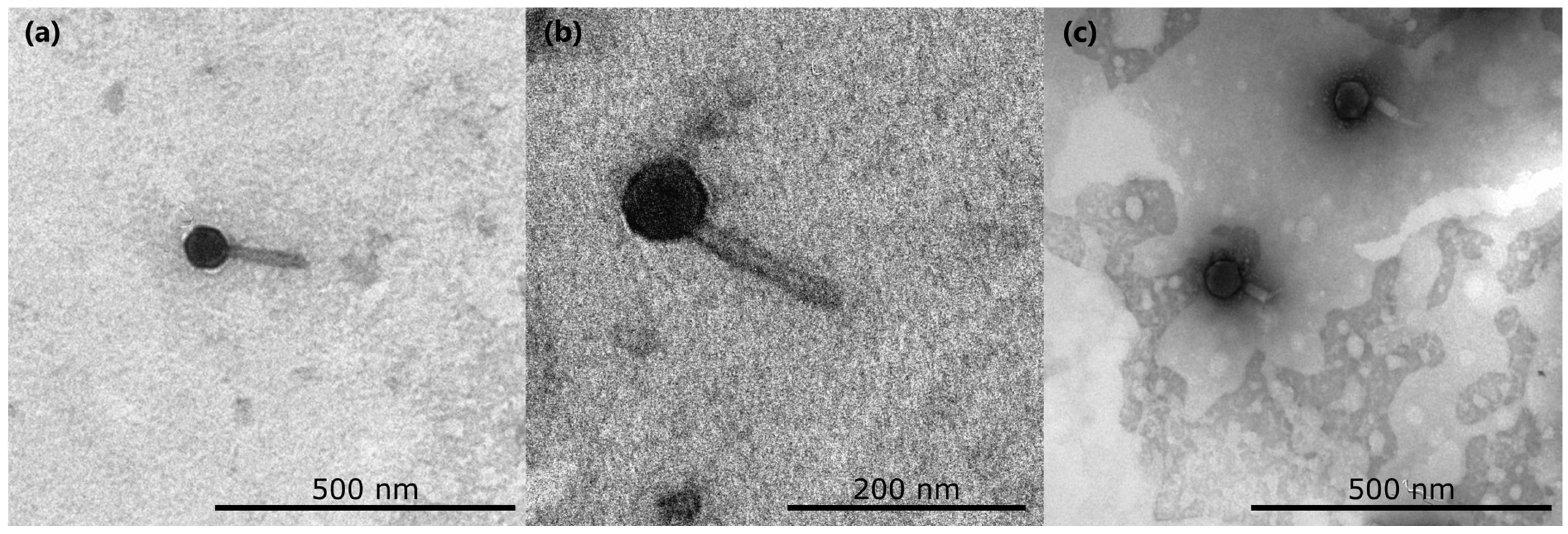 - Nguyen, Q.T.; Luna, A.J.; Hernandez, A.C.; Kuty Everett, G.F. Complete Genome Sequence of Citrobacter Freundii Myophage Moogle. Genome Announc. 2015, 3, e01426-14. [Google Scholar] [CrossRef]
