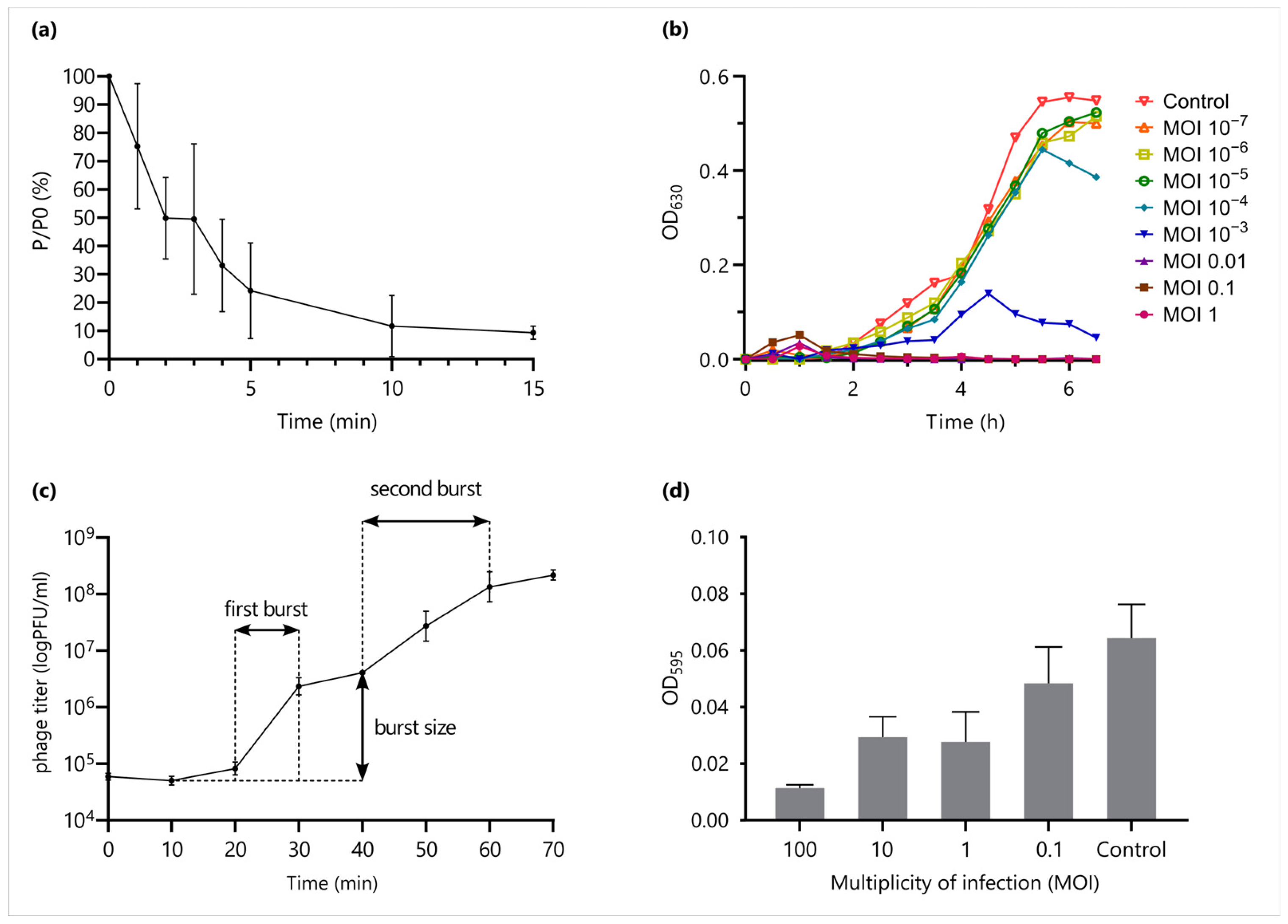 2.3. Phage Adsorption, Lytic Efficiency and One-Step Growth Curve