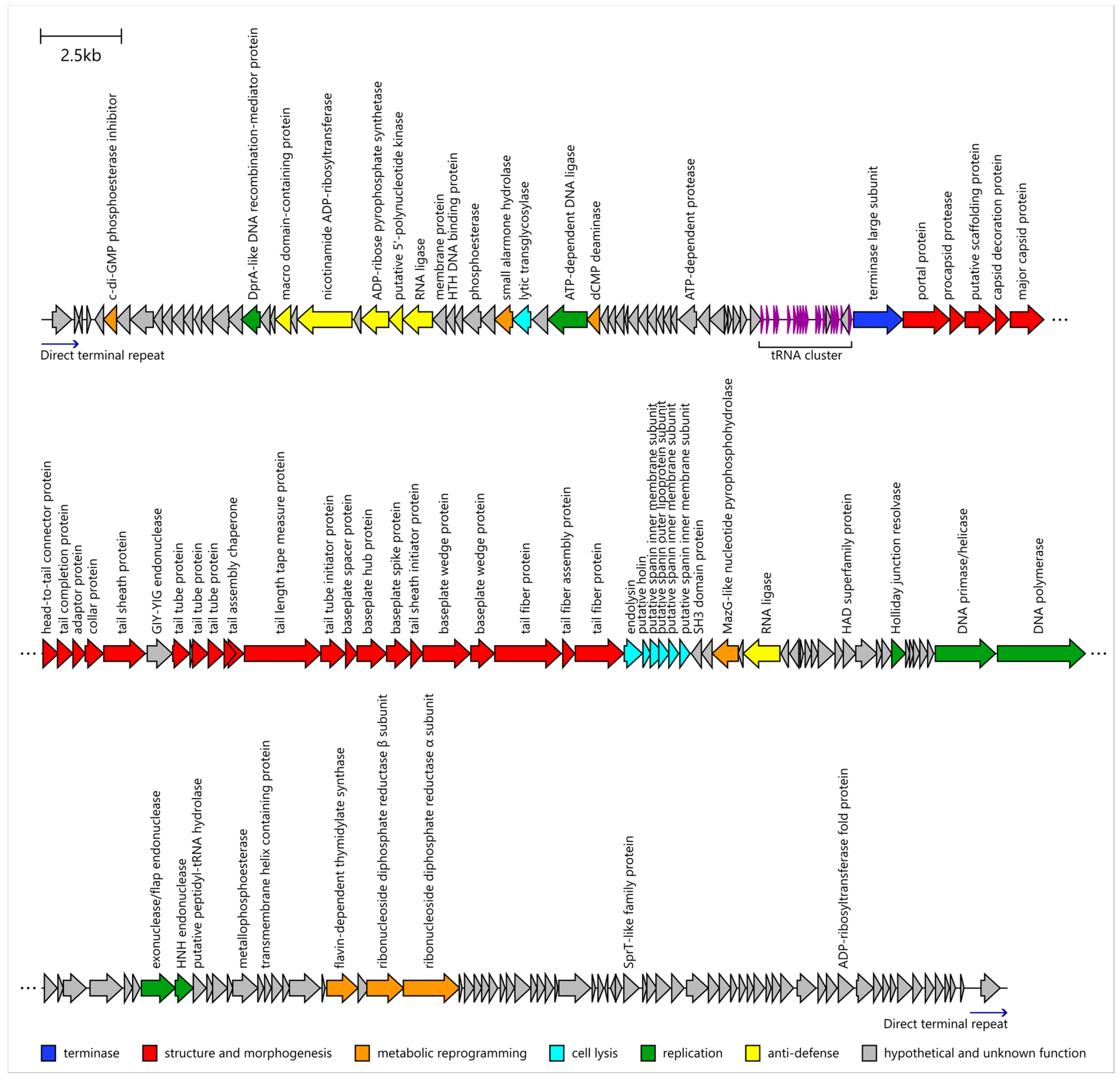 - Blasdel, B.G.; Chevallereau, A.; Monot, M.; Lavigne, R.; Debarbieux, L. Comparative Transcriptomics Analyses Reveal the Conservation of an Ancestral Infectious Strategy in Two Bacteriophage Genera. ISME J. 2017, 11, 1988–1996. [Google Scholar] [CrossRef]