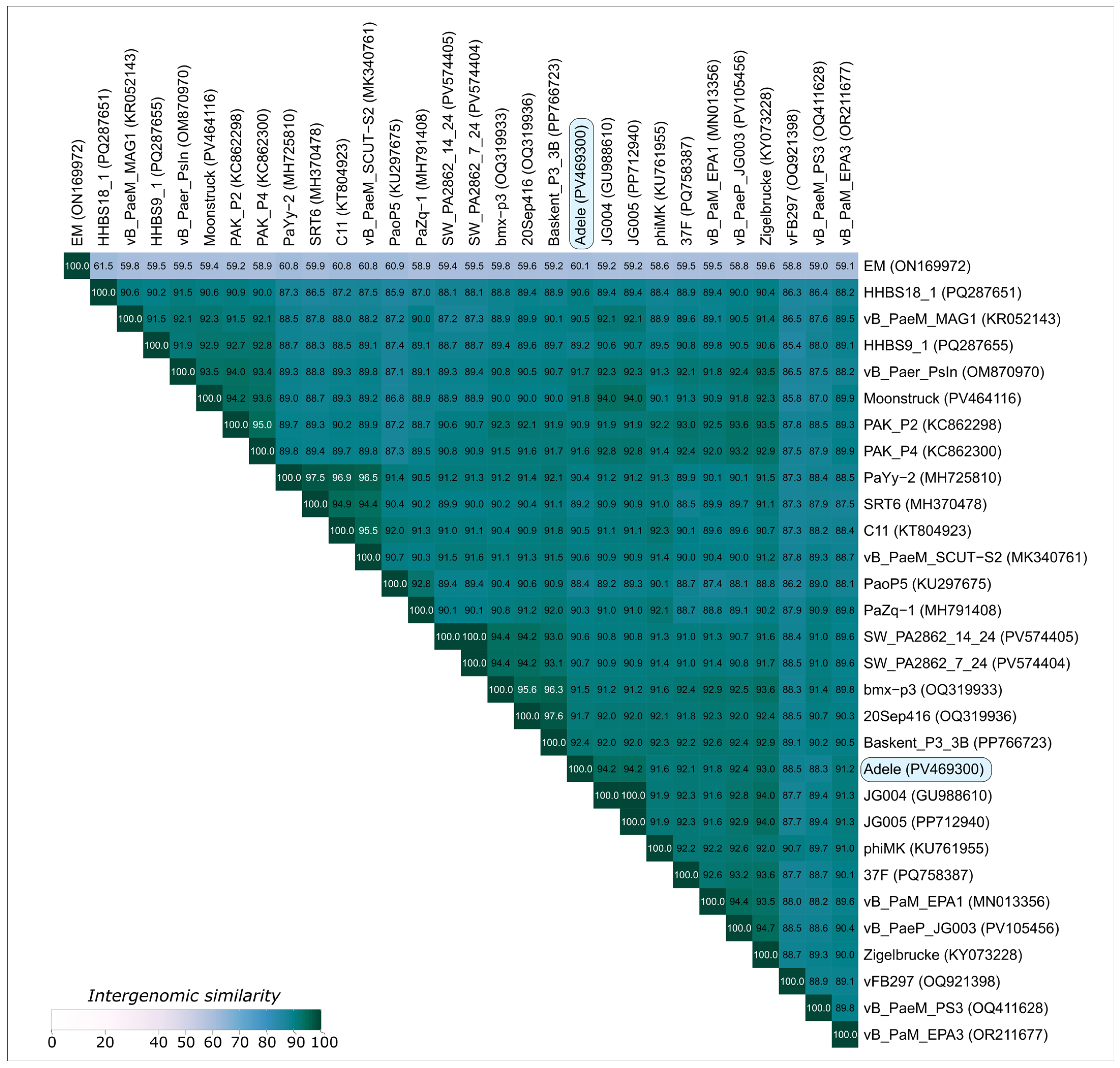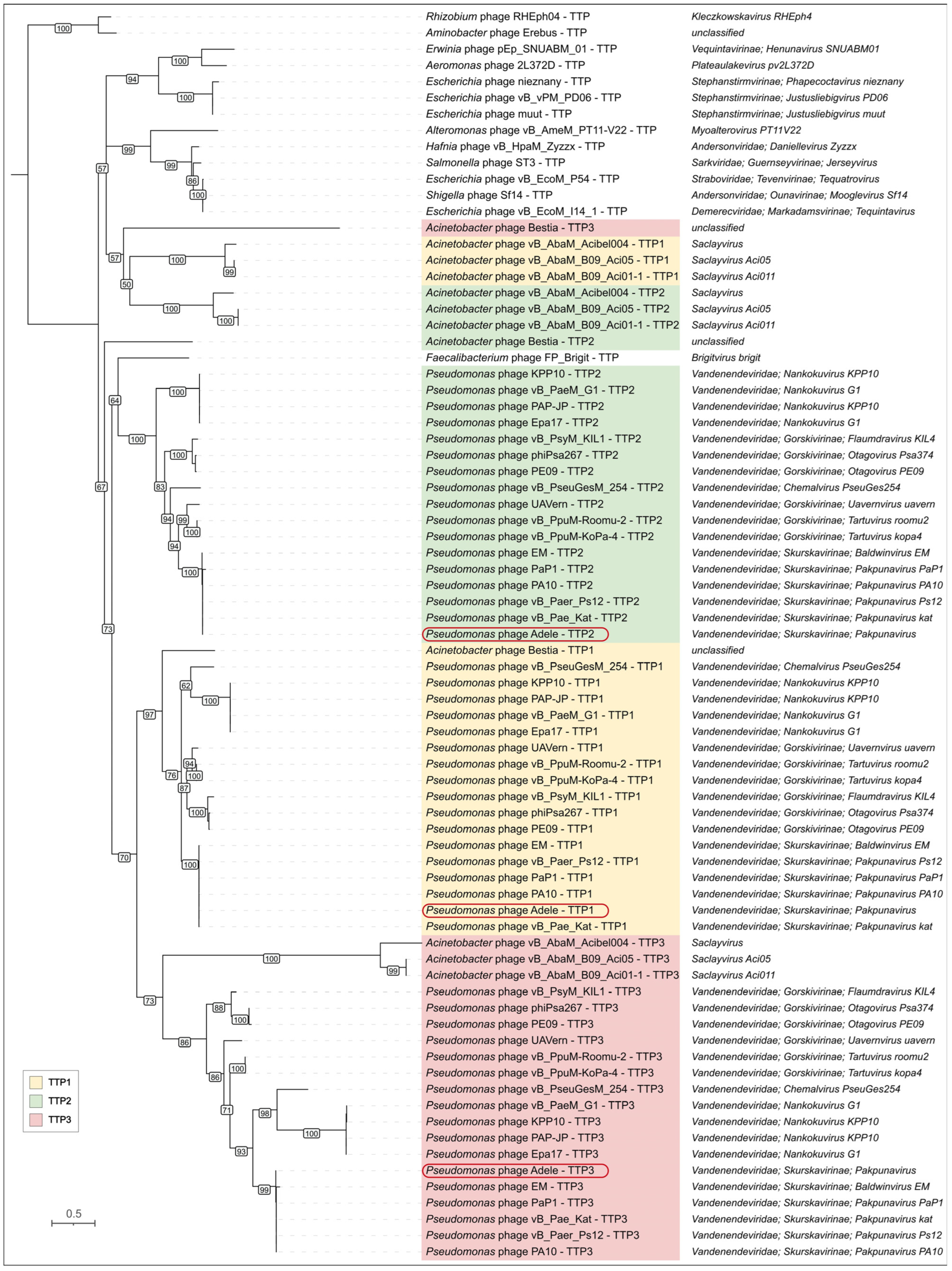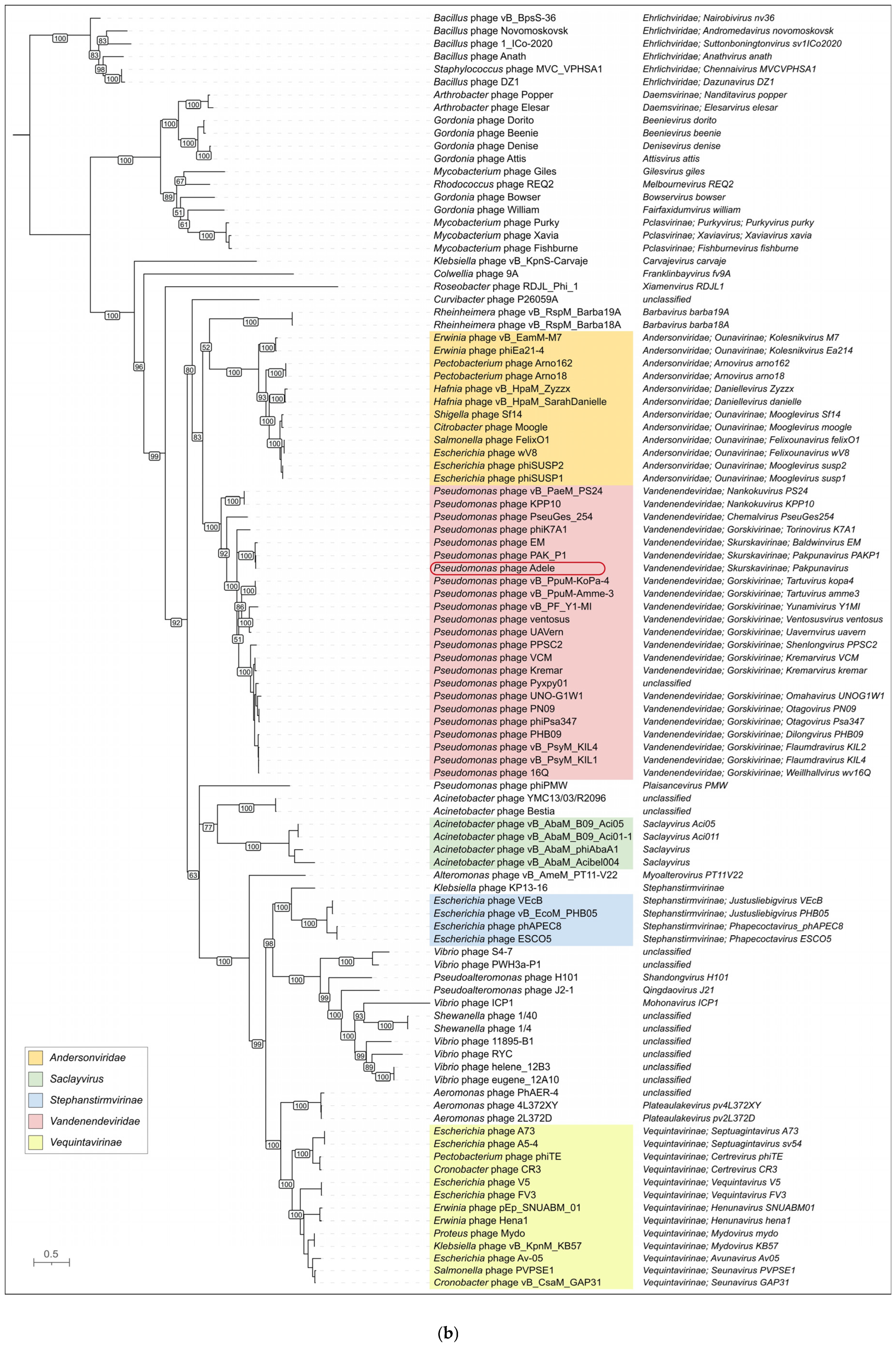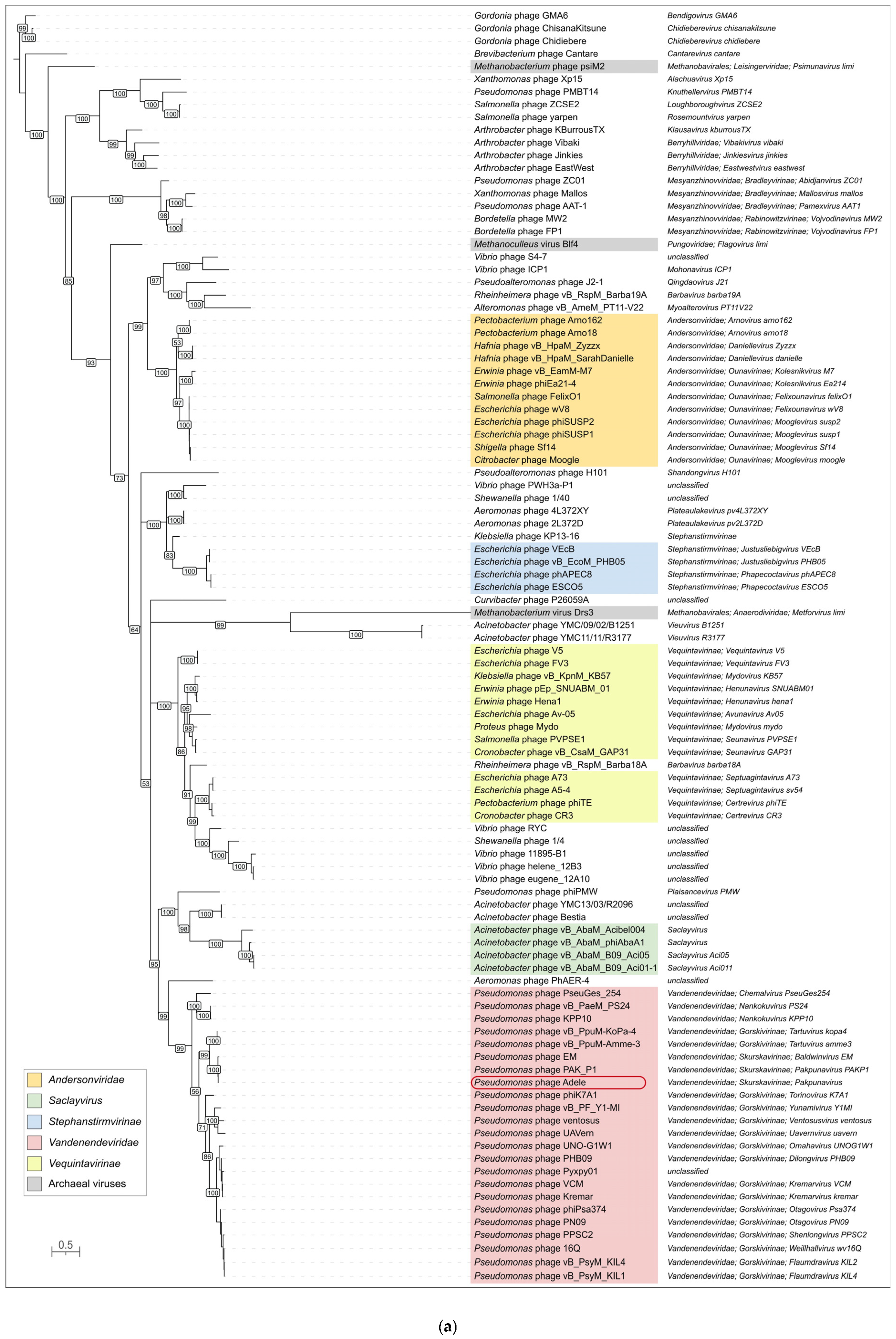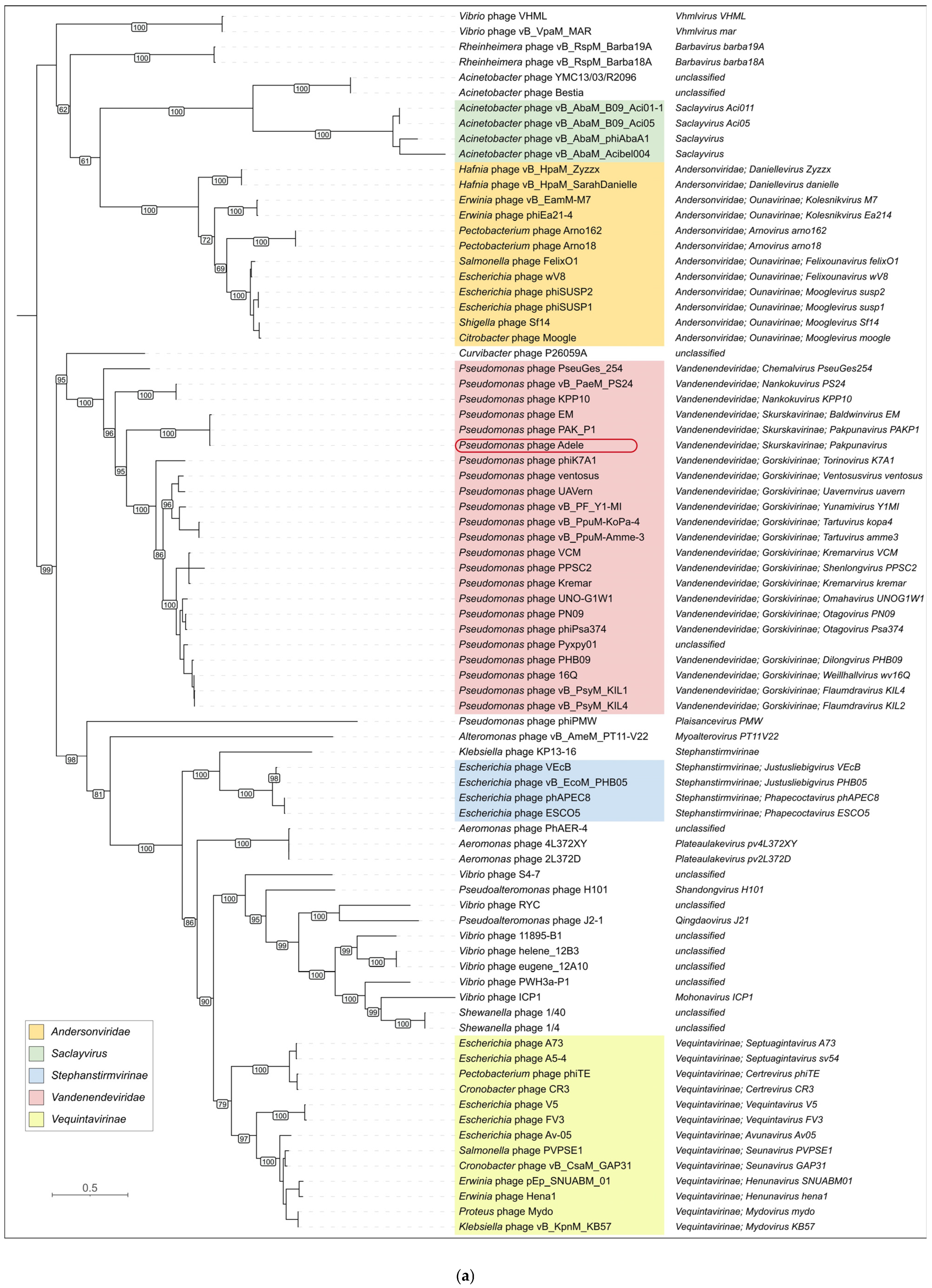 - Other phages infecting Pseudomonas are placed distantly from phage Adele;