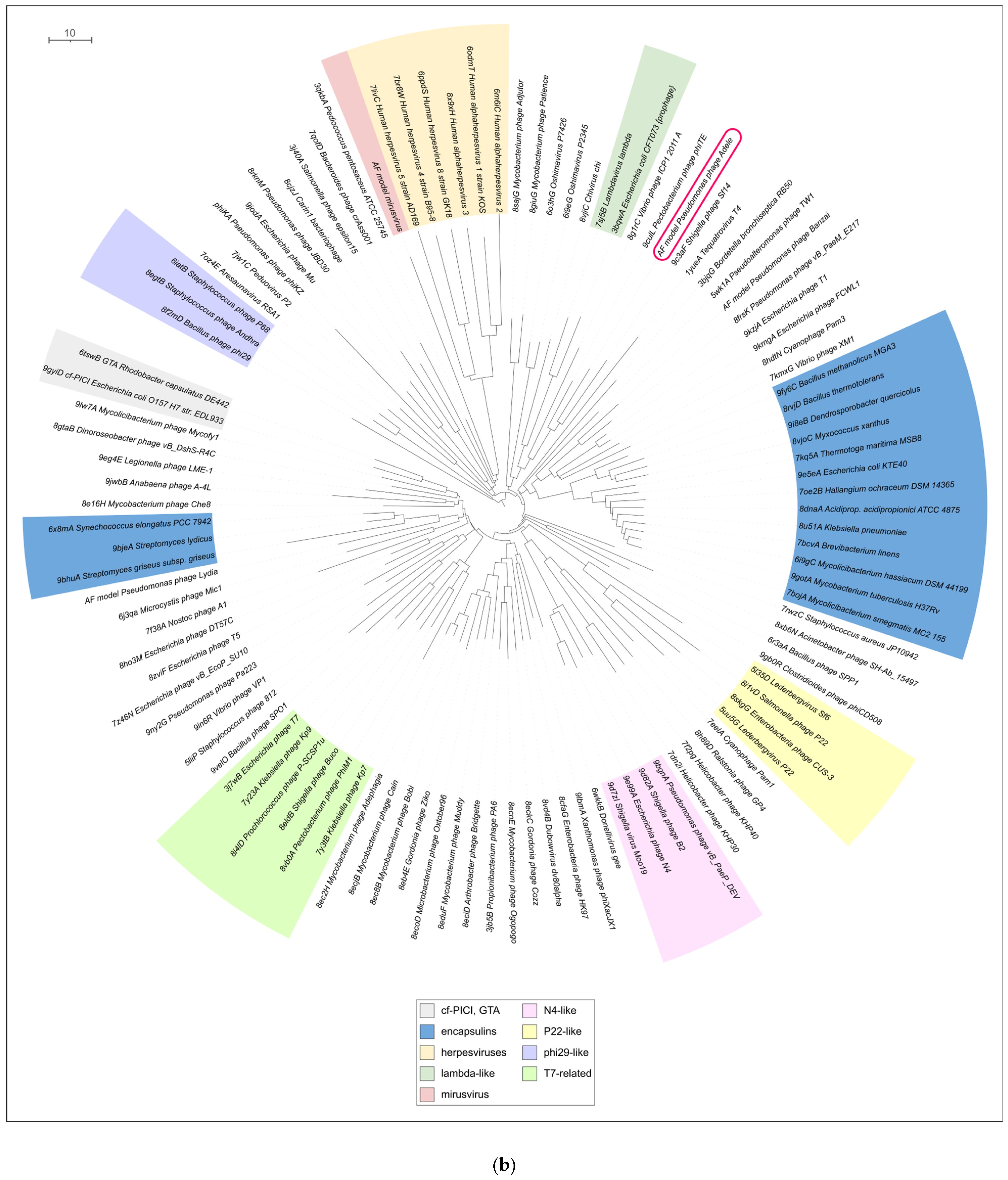 - Evseev, P.; Gutnik, D.; Shneider, M.; Miroshnikov, K. Use of an Integrated Approach Involving AlphaFold Predictions for the Evolutionary Taxonomy of Duplodnaviria Viruses. Biomolecules 2023, 13, 110. [Google Scholar] [CrossRef]