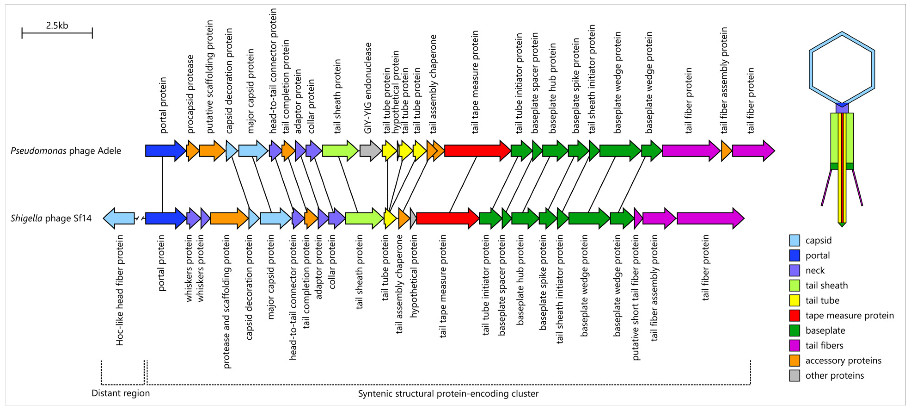 - Subramanian, S.; Kerns, H.R.; Braverman, S.G.; Doore, S.M. The Structure of Shigella Virus Sf14 Reveals the Presence of Two Decoration Proteins and Two Long Tail Fibers. Commun. Biol. 2025, 8, 222. [Google Scholar] [CrossRef] [PubMed]
