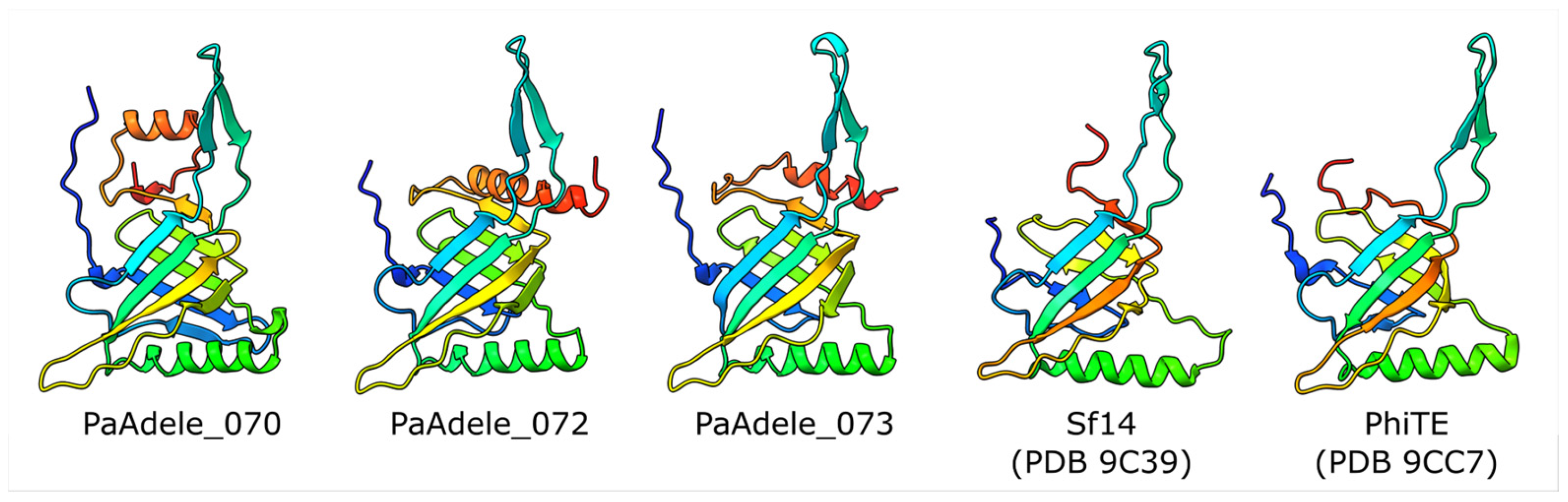 - Protein PaAdele_022—homologous proteins from phages of the families Herelleviridae, Ackermannviridae and several other taxa are more similar to the Adele protein than those from the evolutionarily related taxa discussed in Section 3.7.