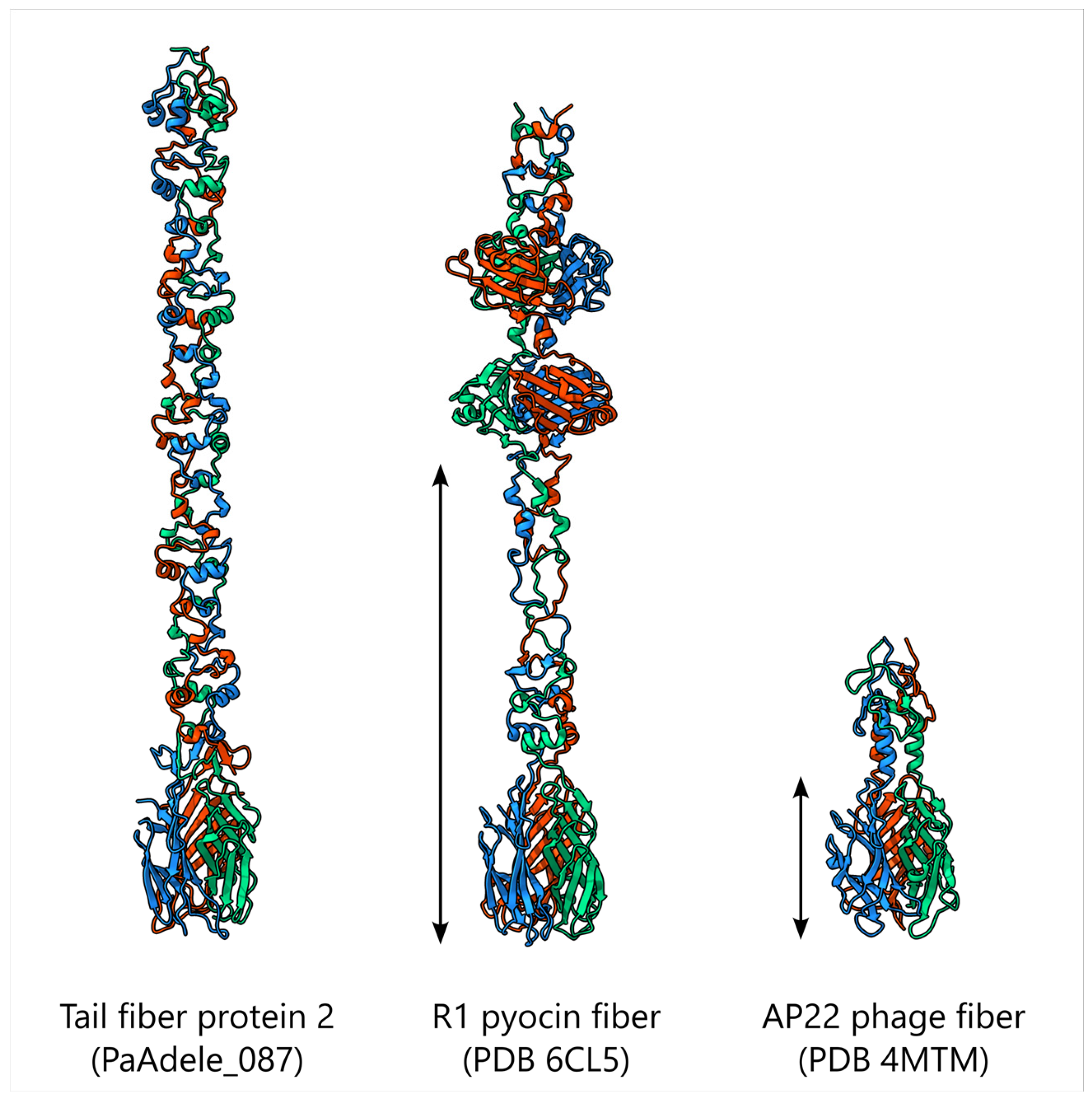 - Buth, S.A.; Shneider, M.M.; Scholl, D.; Leiman, P.G. Structure and Analysis of R1 and R2 Pyocin Receptor-Binding Fibers. Viruses 2018, 10, 427. [Google Scholar] [CrossRef]