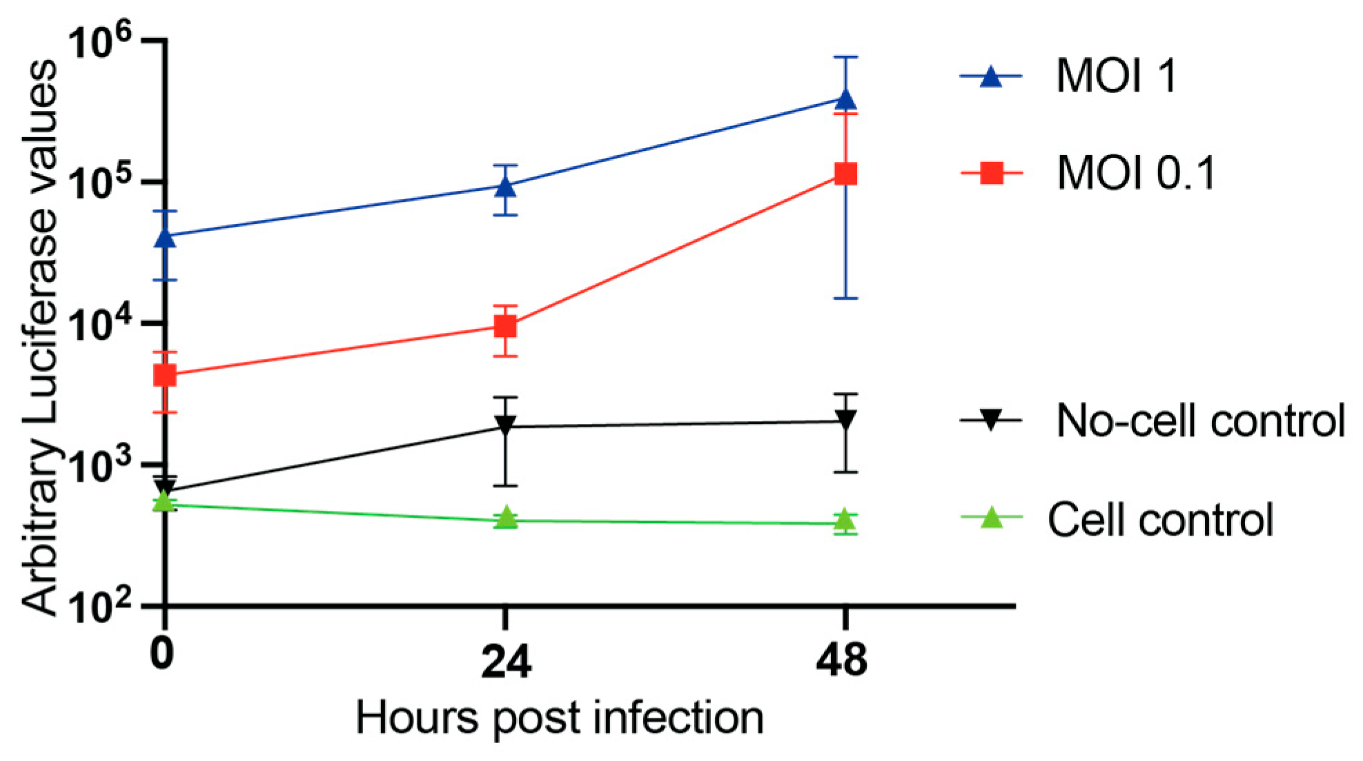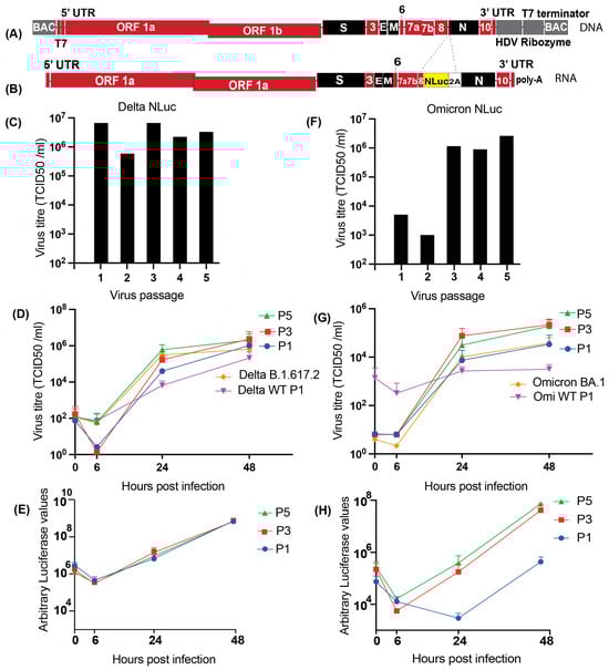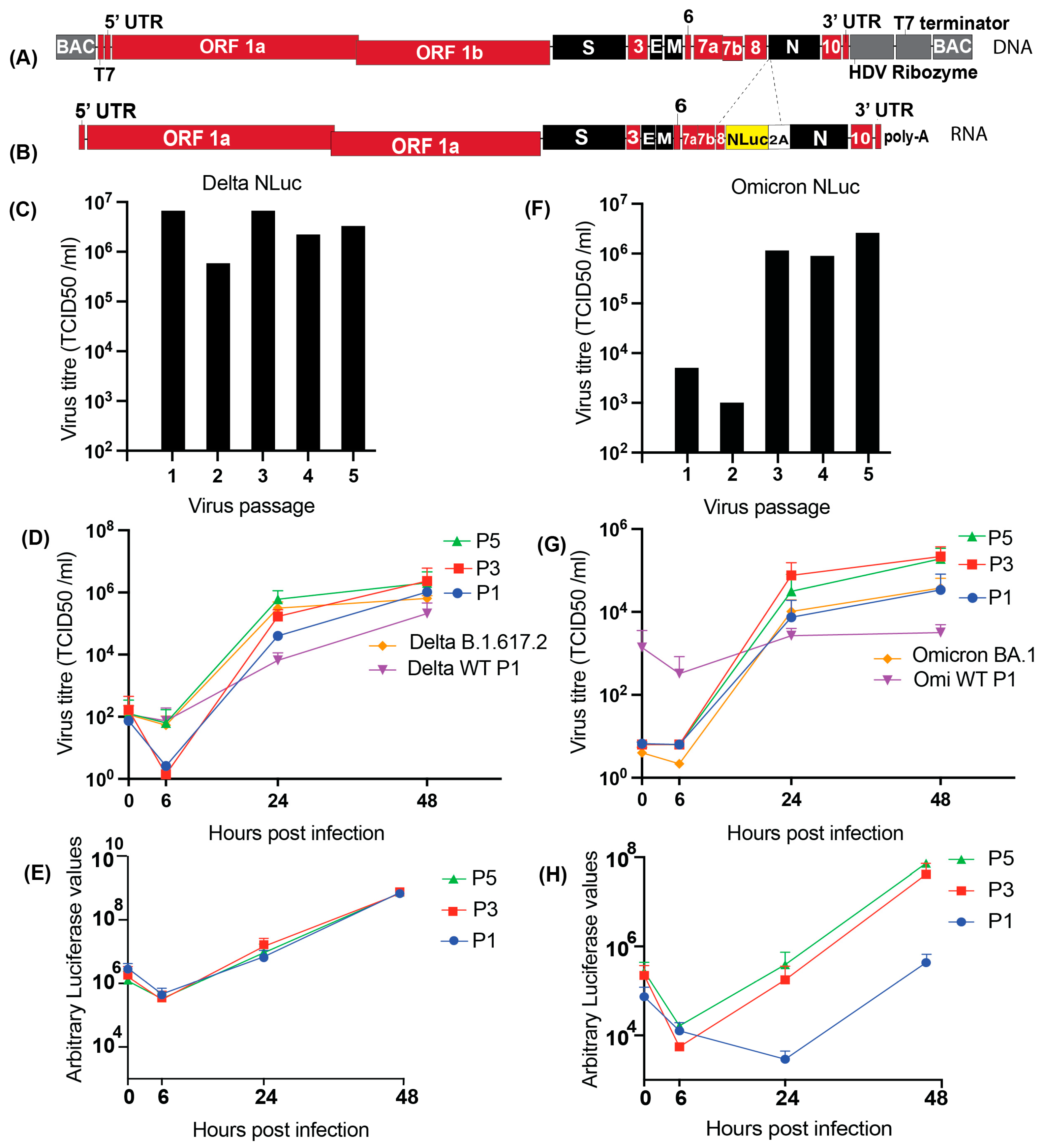 3.4. Generation of SARS-CoV-2 Delta and Omicron Nano Luciferase Reporter Molecular Clones