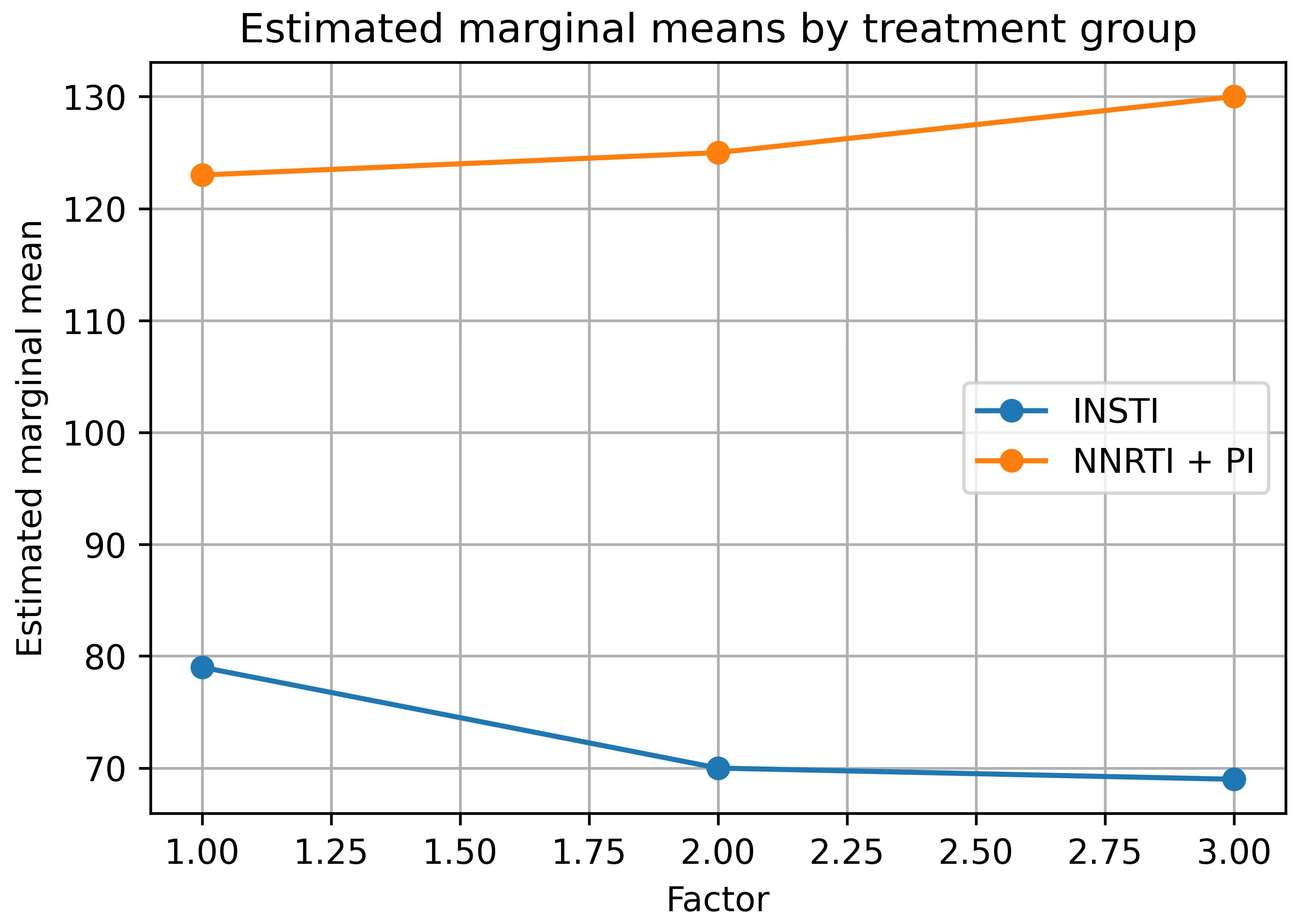 The between-subjects factor (ART regimen class) allows assessment of overall differences in outcome levels between treatment groups, while the time × treatment group interaction specifically evaluates whether the temporal trajectory of change differs between regimens, independent of baseline values. This analytical framework is appropriate for addressing our primary research question regarding differential metabolic effects of INSTI-based versus NNRTI/PI-based therapy in clinical practice. To evaluate longitudinal changes in laboratory parameters over time (baseline, 1 year, and 2 years), a repeated-measures ANOVA was conducted, with ART regimen (INSTI vs. NNRTI/PI) as the between-subjects factor and time as the within-subjects factor.