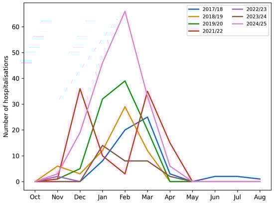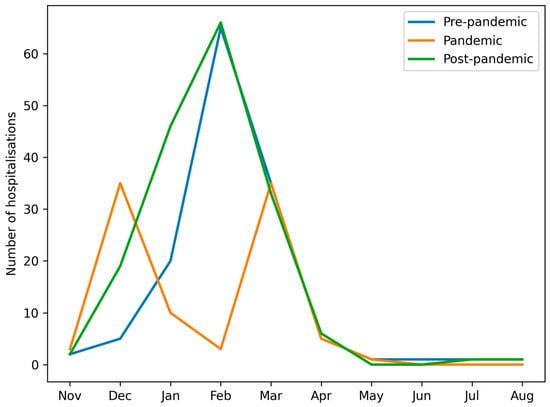 These pairwise comparisons were pre-specified as the primary analyses to evaluate differences in influenza epidemiology across the three defined periods. Secondary/exploratory analyses included descriptive assessment of monthly and seasonal trends, age group distribution, and potential interactions between influenza type and length of hospitalisation. Statistical significance was defined as a p-value < 0.05. Analyses were performed using Statistica v.13 (StatSoft, Tulsa, OK, USA).