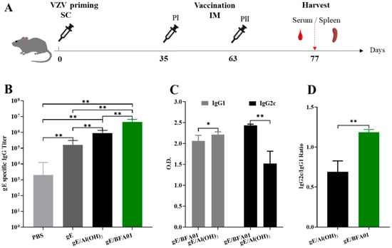 Immunization schedule and gE-specific IgG titers. (A) Schematic diagram of the vaccine immunogenicity evaluation experiment in C57BL/6N mice. Mice (n = 6 per group) were immunized subcutaneously with live attenuated VZV vaccine on d0, then immunized intramuscularly twice with 5 μg of gE alone or 5 μg of gE formulated with Al(OH)3 and BFA01 adjuvant on d35 and d63; meanwhile, the mice injected twice with PBS served as a control group. The mice were sacrificed 14 days after the last immunization and serum or spleen was collected for analysis. (B) gE-specific IgG antibody titers were detected using ELISA; geometric means with 95% confidence intervals are shown. (C) gE-specific IgG1 and IgG2c antibodies in the gE/BFA01 group and gE/Al(OH)3 group. (D) IgG2c/IgG1 ratio in the gE/BFA01 and gE/Al(OH)3 groups. IgG1 and IgG2c antibody levels were measured in 5000-fold diluted serum and the values were determined from the absorbance values measured at 450 nm; data are shown as the mean and standard deviation (SD). The Mann–Whitney test was used for the statistical analysis; * p < 0.05, ** p < 0.01.