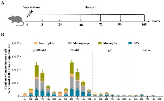 The BFA01 adjuvant enhanced the number of innate immune cells at the injection site of the C57BL/6N mice. (A) Schematic diagram of mouse experiments. The mice were immunized with a single dose of BFA01 or/and gE antigen via the gastrocnemius muscles of both hind limbs; the injection site muscles were isolated for 3–168 h (=day 7) post-injection and analyzed using flow cytometry. The mice injected with saline served as a control group. (B) Number of innate immune cells in the muscle injection site at different timepoints; data are shown as mean + SD (n = 5).