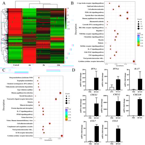 Modulation of gene expression after BFA01 adjuvant immunization in C57BL/6N mice. Mice were intramuscularly immunized once with BFA01 adjuvant or PBS, while non-immunized mice served as the control. The inguinal lymph nodes were collected at the indicated time points for analysis. (A) Heatmap of differentially expressed genes in inguinal lymph nodes at 3, 6, and 24 h after the BFA01 immunization. (B) Scatter plot of the enrichment analysis for differentially expressed genes at 6 h (the x-axis represents the ratio of the number of differentially expressed genes annotated to KEGG pathways to the total number of differentially expressed genes, and the y-axis represents the KEGG pathways; the same applies below). (C) Scatter plot of the enrichment analysis for differentially expressed genes at 24 h. (D) Cytokine and chemokine gene levels in dLN at 6 h after treatment. Data are shown as mean + SD (n = 3).
