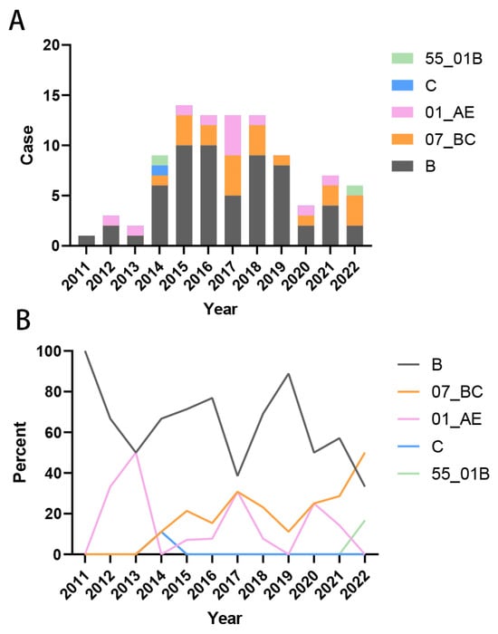 3.4. Trends in HIV-1 Subtype Distribution over Time of Infection