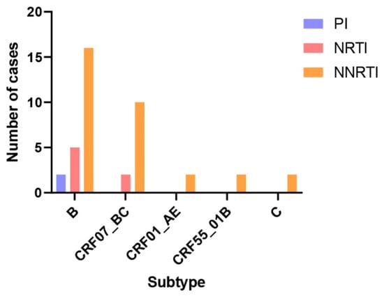 - Liu, X.; Wang, D.; Hu, J.; Song, C.; Liao, L.; Feng, Y.; Li, D.; Xing, H.; Ruan, Y. Changes in HIV-1 Subtypes/Sub-Subtypes, and Transmitted Drug Resistance Among ART-Naïve HIV-Infected Individuals-China, 2004–2022. China CDC Wkly. 2023, 5, 664–671. [Google Scholar] [CrossRef]