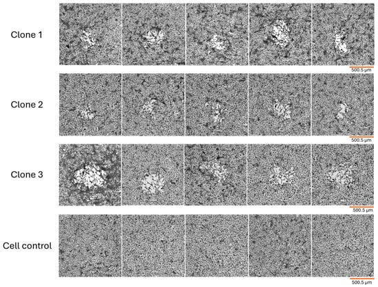 The three MPXV clones obtained exhibited an irregular format, maintaining this characteristic from the early infection. We observed that the plaque size for each clone was roughly the same when comparing plaques from the same clone after 48 h of infection. Precisely measuring lysis plaques was not our primary objective, given the irregular nature of MPXV plaques, but the length of a total of ten plaques per final isolated clone were randomly measured and the average plaque size was calculated. However, when we compared the plaques from the three MPXV clones, we observed slight size variations, with clone 2 presenting the smallest plaques with 273.45 µm average length, followed by clone 1 with 362.34 µm, and clone 3 with 493.72 µm, approximately. All plaques presented stressed cells at the periphery and stressed cells or cell debris within (Figure 1). Moreover, in an attempt to observe more pronounced variation in plaque size among the final isolated clones, we also evaluated the plaque phenotypes after 72 h of infection. However, the longer incubation period did not result in larger lysis plaques forming, so we maintained a 48 h incubation period.