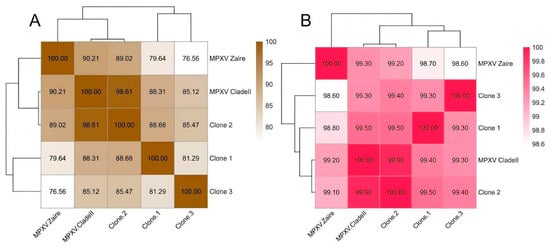Heatmaps comparing the clone genomes between each other and the references. (A) Genomes identities between the clade I reference (MPXV Zaire), clade II reference and the clones generated in this work. (B) Average nucleotide identities between the clade I reference (MPXV Zaire), clade II reference and the clones generated in this work.