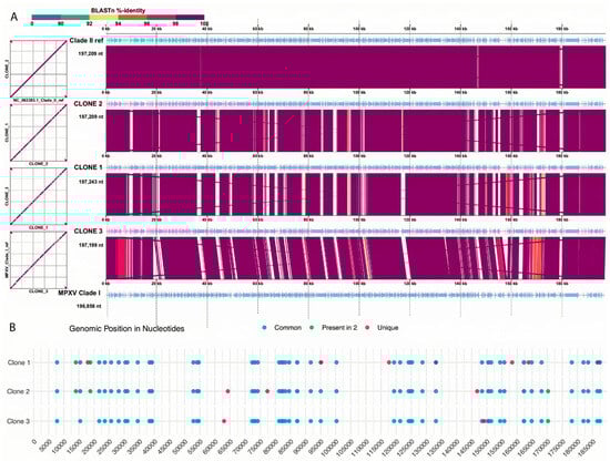 Synteny analysis confirmed the similarity results, with clones 2 and 3 presenting a distinct dissimilarity close to the 14 kb mark of the genome. Single nucleotide variation (SNV) analysis showed a similar result with most of the mutations present in proximity to the 14 kb mark and close to the last portion of the pox genome. Using an in-house script (https://github.com/iza-mcac/2025-10-Pox-Variant_calling (accessed on 12 September 2025)) we called SNVs in all the ORFs associated with the annotated CDS, which found from 54 to 60 SNVs present in each clone (Figure 5). Among these SNVs we found two variants in common between two clones and ten variants that were clone specific (Figure 5B).