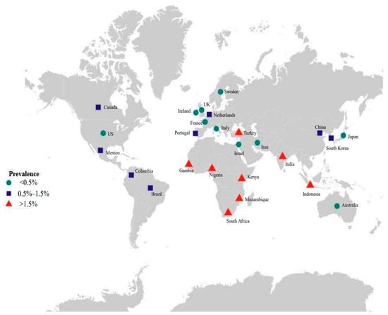 Cytomegalovirus (CMV) is a common infection that infects a majority of people worldwide, and approximately 83% of the general population is seropositive [15]. Several studies have estimated that the seroprevalence among women of childbearing age ranges from 70% to 92% across different regions, and the global rate is 86% [15,16]. CMV can be transmitted from mother to fetus; therefore, cCMV is the most common form of intrauterine infection [17]. cCMV infection in high-income countries occurs in approximately 0.48% of all live births, while it occurs in approximately 1.42% of all live births in low- to middle-income countries [18] and is more common in South Africa and Indonesia (Figure 1). When focusing on cCMV in newborns, the status of CMV in pregnancy should also be known.