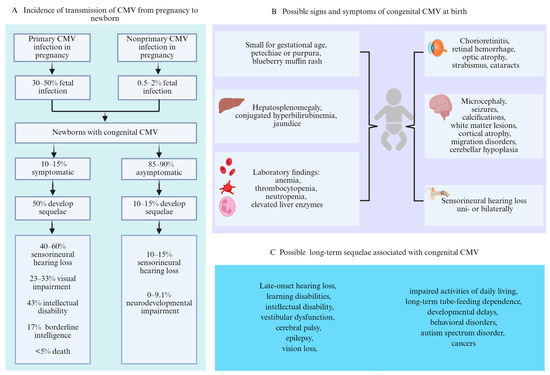 Transmission, possible signs and symptoms at birth, and long-term sequelae of congenital CMV. (A) Incidence of transmission of CMV from pregnancy to newborn. (B) Possible signs and symptoms of congenital CMV at birth. (C) Possible long-term sequelae associated with congenital CMV.