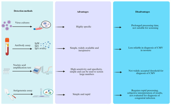 The use of pp65-specific monoclonal antibodies to detect CMV antigens in polymorphonuclear leukocytes can help to diagnose CMV infection and monitor treatment in immunocompromised patients [63]. Quantitative results were obtained by counting and reporting the number of positive cells among 2 × 105 peripheral blood leukocytes [64]. Moreover, the evaluation of antigen-positive cells significantly correlates with the severity of CMV infection [65]. Studies have shown that the pp65 antigenemia assay yields comparable results to techniques based on molecular amplification [66]. This assay must be processed immediately after sample collection. Moreover, there are issues such as subjectivity in quantification and lack of standardization across different laboratories [63]. Another limitation is that it requires an adequate number of neutrophils, which may not be possible in newborns because of difficulty in obtaining sufficient blood. Furthermore, this method has been less commonly evaluated for the diagnosis of cCMV infection in newborns.
