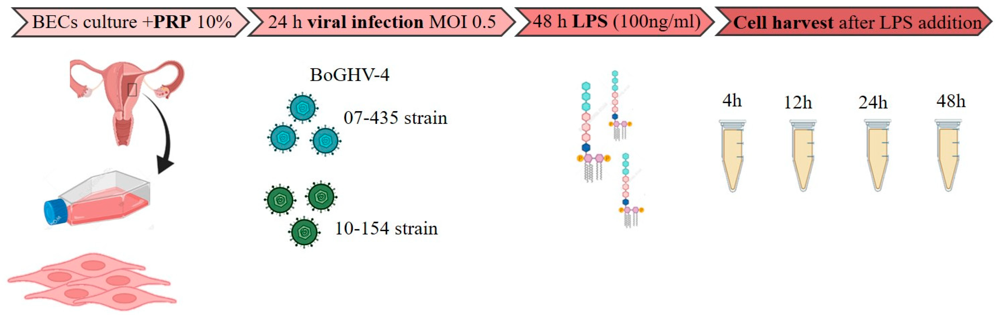 To investigate whether the modulatory effect of platelet-rich plasma (PRP) on BoGHV-4 infection is genotype-dependent, bovine endometrial cells (BECs) were infected with either strain 07-435 (Genotype 3) or strain 10-154 (Genotype 2) at a multiplicity of infection (MOI) of 0.5. Following viral adsorption and subsequent stimulation with lipopolysaccharide (LPS, E. coli O55:B5, 100 ng/mL), cells were collected at four post-stimulation time points (4, 12, 24, and 48 h). PRP (10%) was included as a constant supplement of the culture medium for all experimental groups and was therefore not considered a treatment factor.