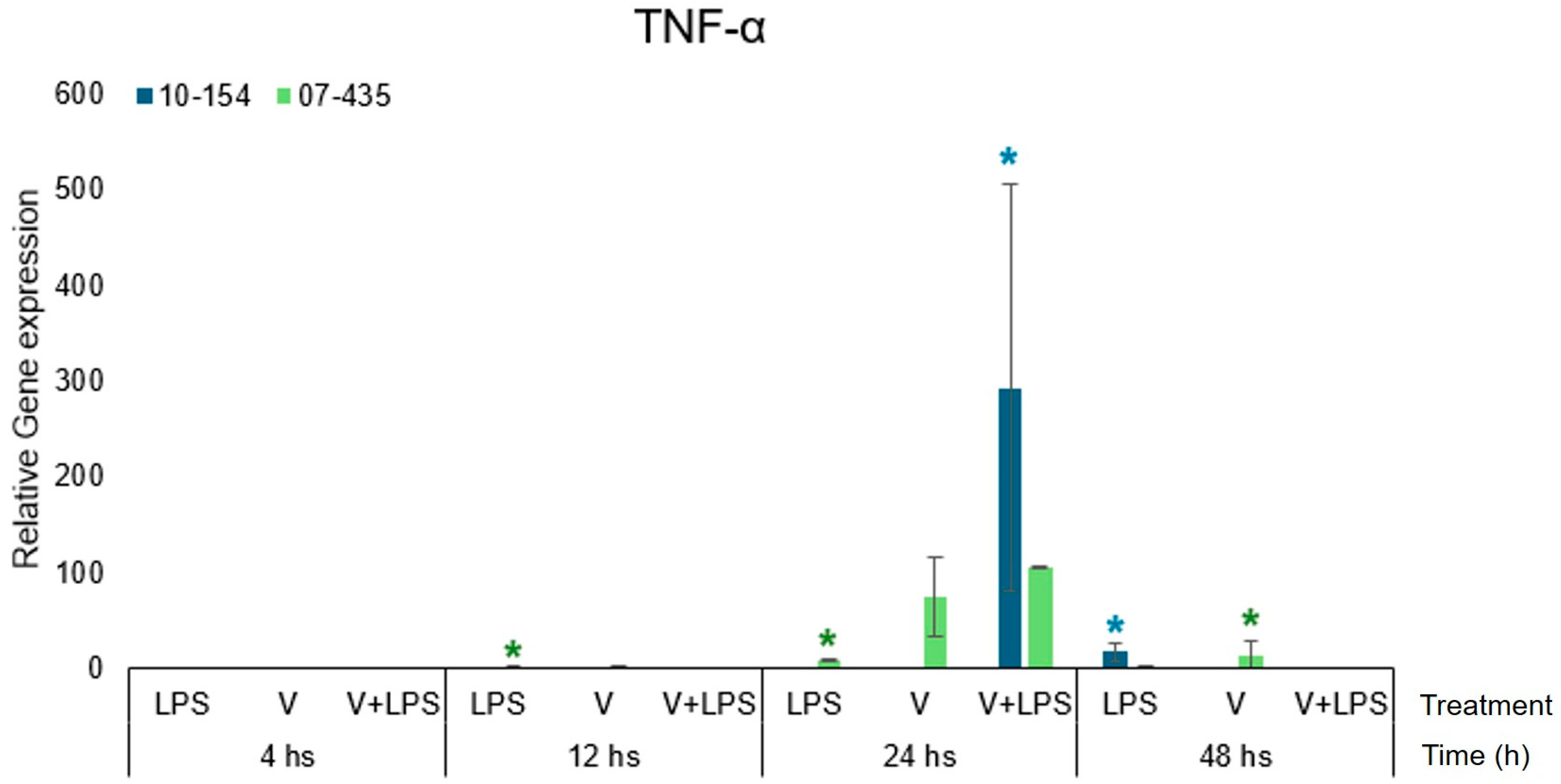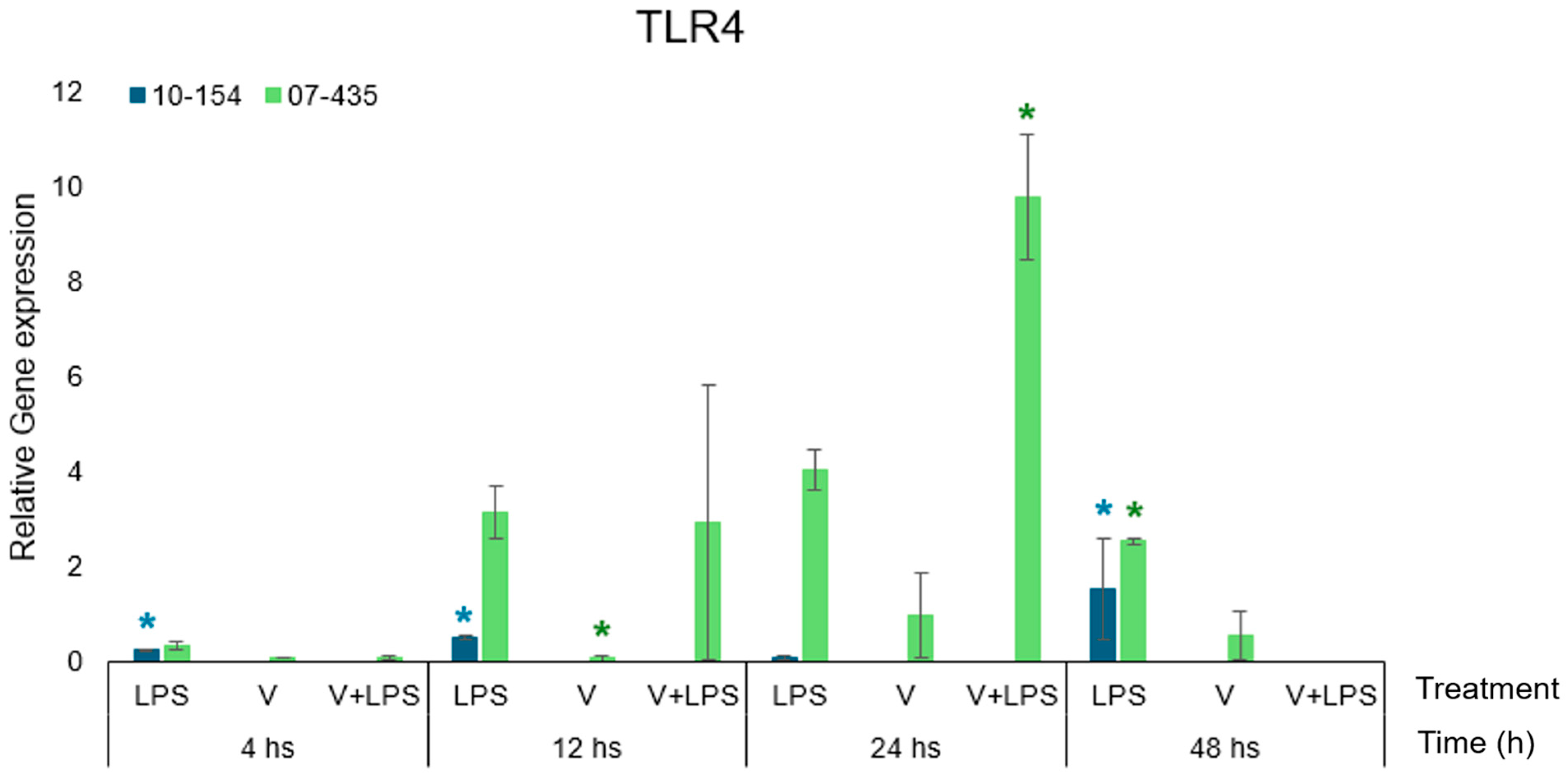 In contrast, strain 10-154 (genotype 2) showed only modest changes in TLR4, with limited or no further induction upon LPS stimulation. Direct comparison demonstrated that strain 07-435 induced significantly higher TLR4 transcription than strain 10-154 at nearly all time points, particularly under V+LPS conditions.