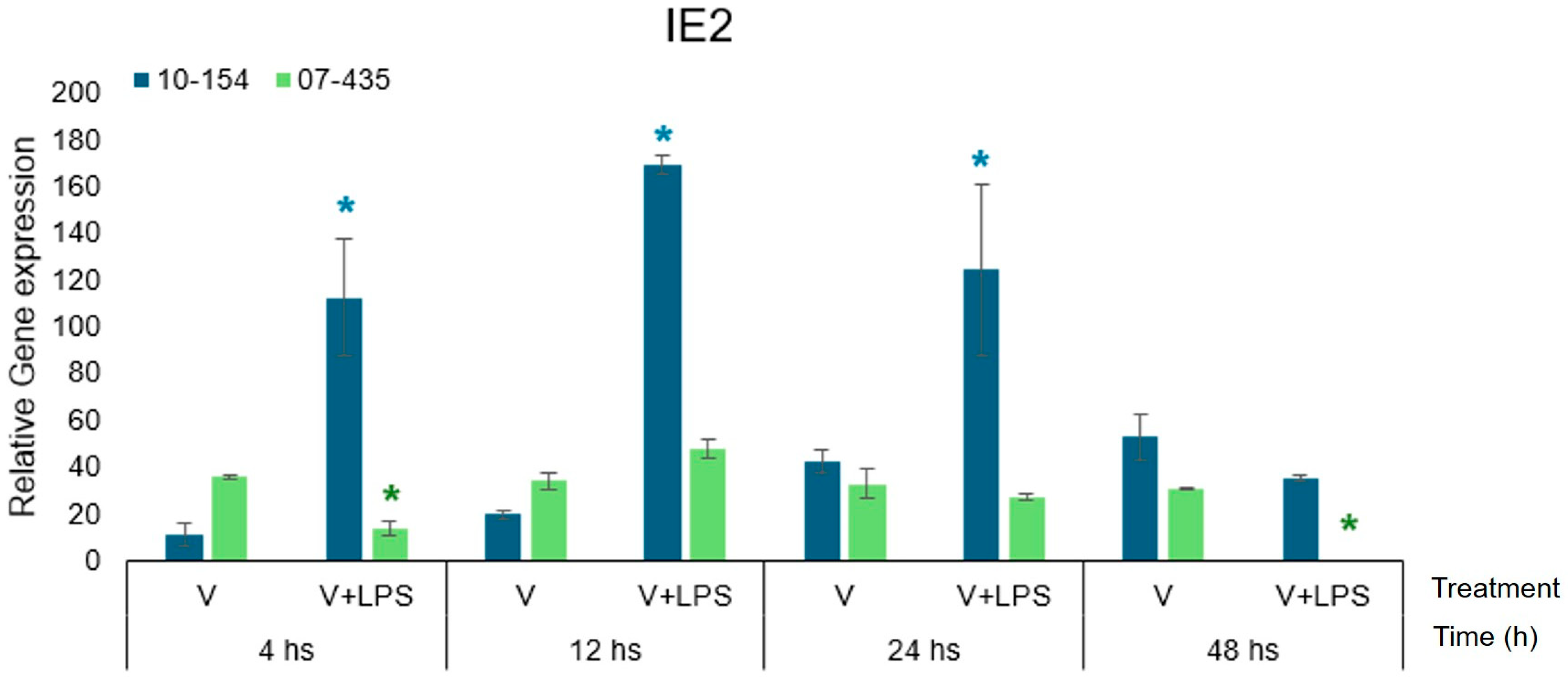 In contrast, strain 10-154 (genotype 2) displayed a transient yet markedly amplified increase in IE-2 expression, particularly under V+LPS stimulation between 12–24 h, followed by a pronounced decline in transcript levels at 48 h.