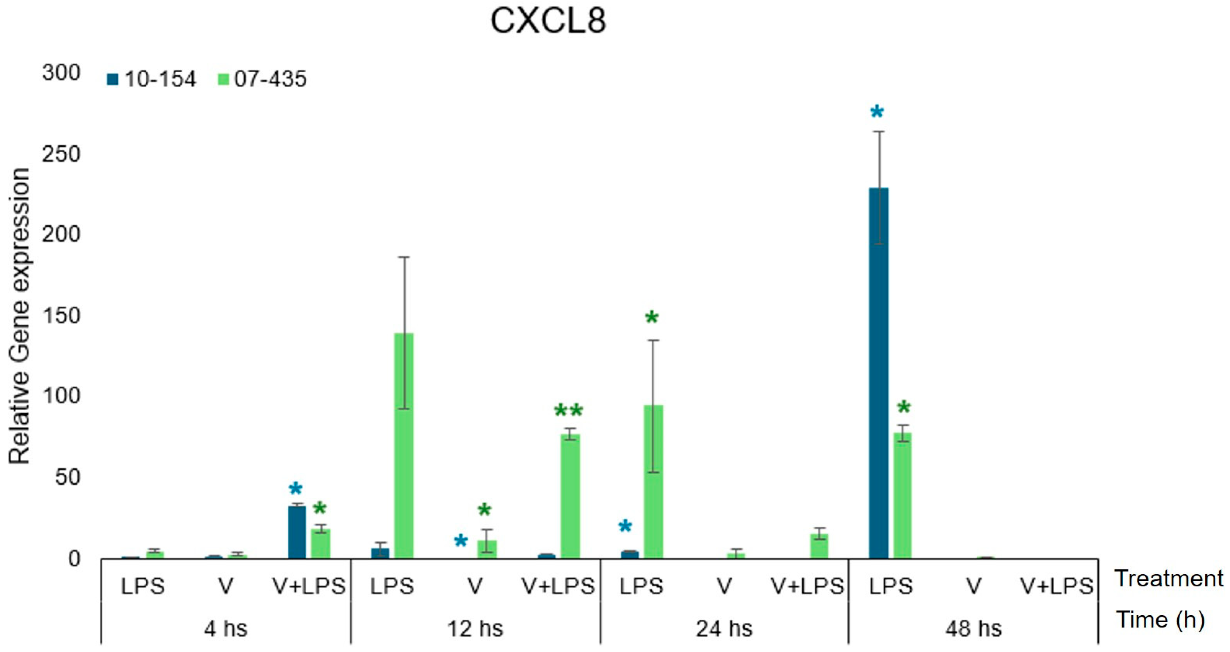 Strain 07-435 elicited a robust CXCL8 response, reaching its highest transcript abundance between 12–24 h under V+LPS stimulation, whereas strain 10-154 exhibited low or variable transcription, with appreciable induction only under V+LPS.