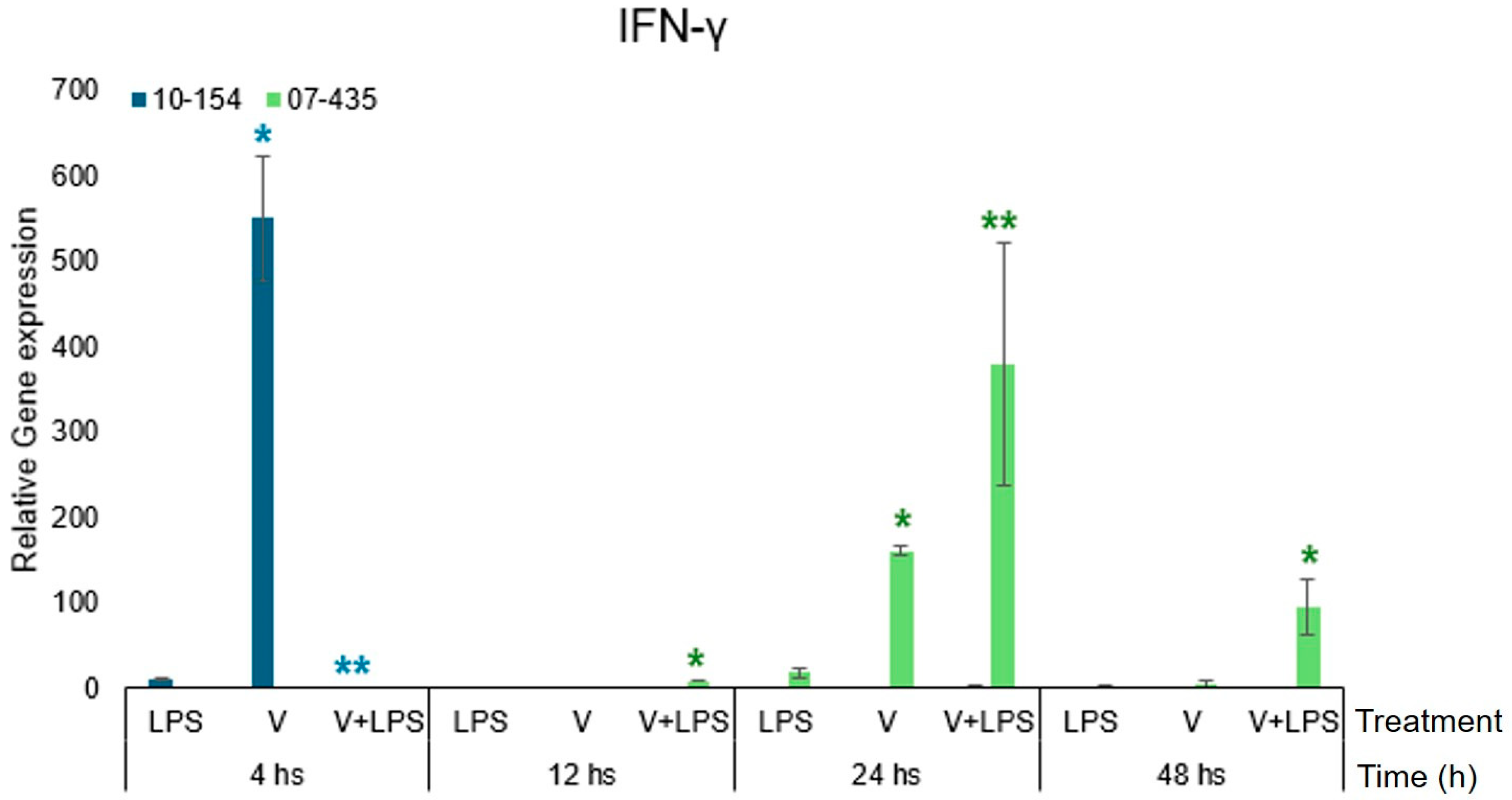 Strain 07-435 induced a delayed yet sustained transcriptional upregulation, which was further amplified by LPS and persisted up to 48 h. In contrast, strain 10-154 triggered an early and pronounced increase in IFN-γ transcript abundance at 4 h, followed by a rapid return to basal transcriptional levels.