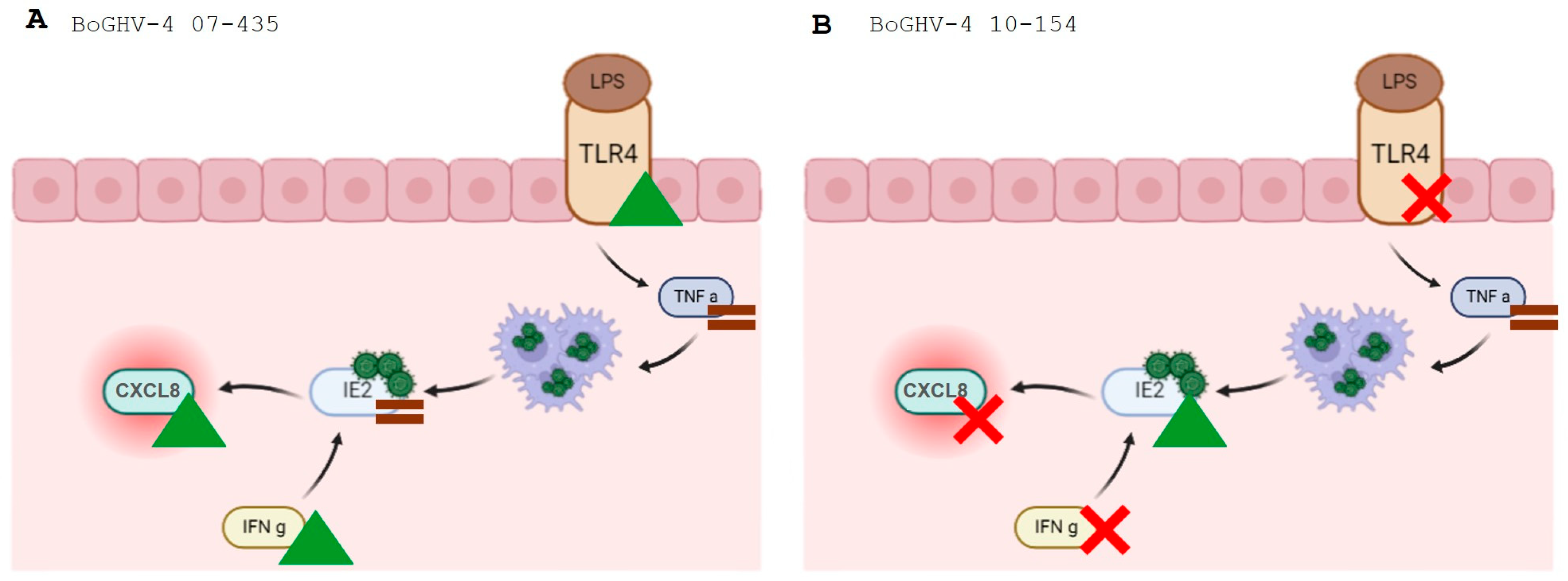 Overall, these results reveal that BoGHV-4 genotype shapes the IE-2 transcriptional phenotype, yielding either a persistent activation profile (07-435) or a transient response potentiated by LPS (10-154).