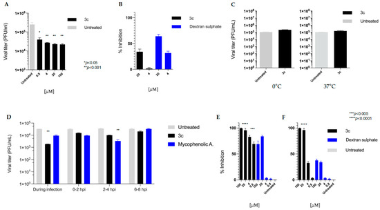 3c exhibited its utmost antiviral activity at the beginning of the infection process (at time 0). As expected, mycophenolic acid, an inhibitor of IMP dehydrogenase, a key enzyme in purine biosynthesis, halted the VV replication cycle during the post-entry phase.