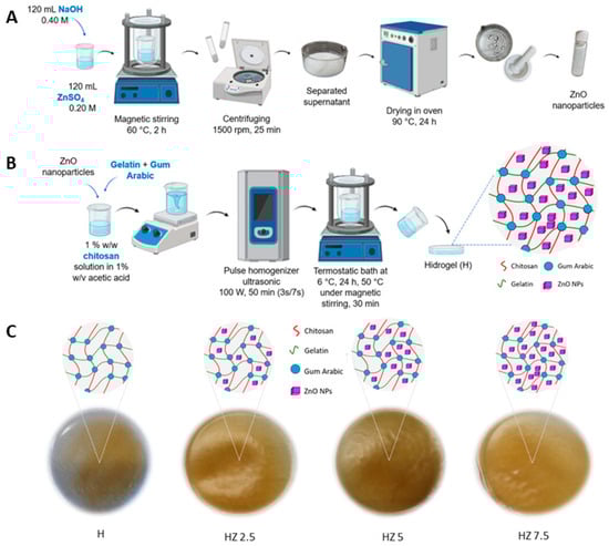 (A) Synthesis of ZnO NPs. (B) Hydrogel synthesis and encapsulation of ZnO NPs, which become entrapped within the polymeric network formed by Ch, G and AG. (C) Schematic of the matrix (H) and hydrogels with different concentrations of ZnO NPs (HZ 2.5, HZ 5 and HZ 7.5).