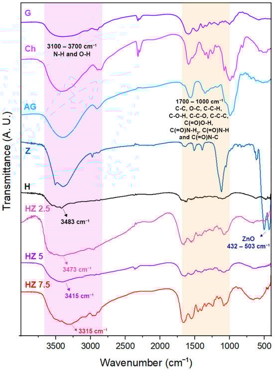 The incorporation of a crosslinking agent was required in order to reach materials stable enough under the application conditions. In order to investigate the possibility of structural changes in G molecules in hydrogels due to interactions with AG and Ch, and to corroborate the presence of ZnO NPs, FTIR spectroscopy was performed. In Figure 2, the spectra of raw biopolymers and ZnO NPs are compared with those corresponding to H and ZnO NP-loaded H.