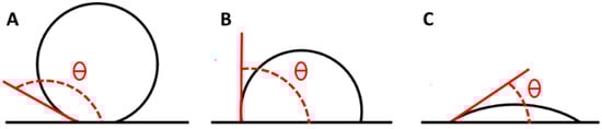 The surface wettability and hydrophobicity can be characterized by measuring the advancing water contact angle, which depends on the balance between cohesive and adhesive forces between water molecules and the H surfaces. Wettability is determined through the surface energy, which depends on physical parameters such as roughness and chemical parameters such as the surface composition. Surfaces exhibiting contact angles above 150° (Figure 3A) are typically classified as superhydrophobic. A value of contact angle of 90° indicates a balance between hydrophilic and hydrophobic characteristics, suggesting an intermediate affinity of the material for the wetting liquid. In this case, the material does not exhibit a strong attraction to, nor a significant repulsion from, the liquid (Figure 3B), while a contact angle below 90° is considered a hydrophilic surface (Figure 3C) [48].