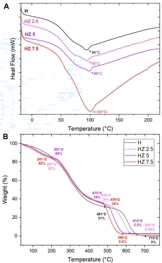 As shown in Figure 7A,B, the thermal stability of the samples was analyzed using thermogravimetric analysis (TGA). Table 3 presents the values obtained from TGA analyses of H, HZ 2.5, HZ 5 and HZ 7.5. The DTG curves are included in Figure S3 of the Supplementary Materials.